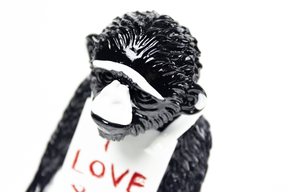 Sculptuur uit kunsthars van Diederik Van Apple. Deze 'street monkeys' zijn met de hand beschilderd en voorzien van een gedrukt opschrift. De oplage is gelimiteerd tot 250 stuks.