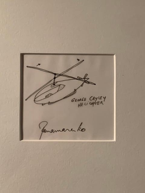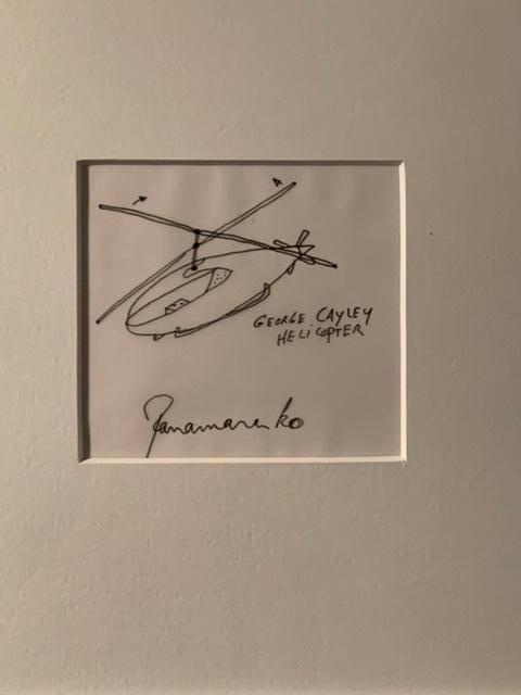 Prachtig en uniek werk van de kunstenaar Panamarenko. Dit is een unieke tekening dat een studie voorstelt van George Cayley Helicopter. Het werk is met de hand gesigneerd en mooi ingelijst in een witte kader!