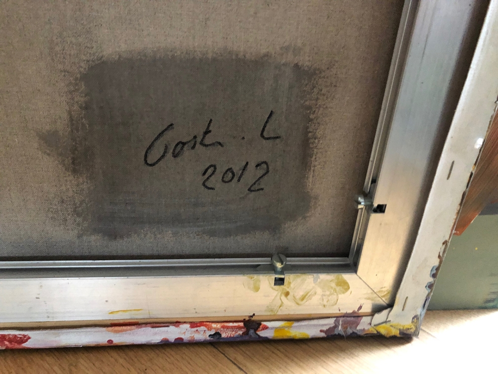 This work is an abstract work. Made in 2012. Portrait image 120 x 60 cm. I leave what you see to the imagination of the spectator. Beautiful painting that has received a lot of admiration. More work by Lambert Oostrum can be found at www.lambertoostrum.nl .