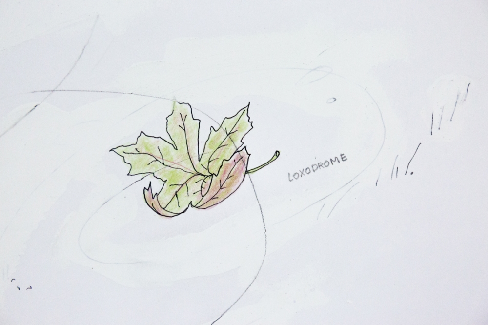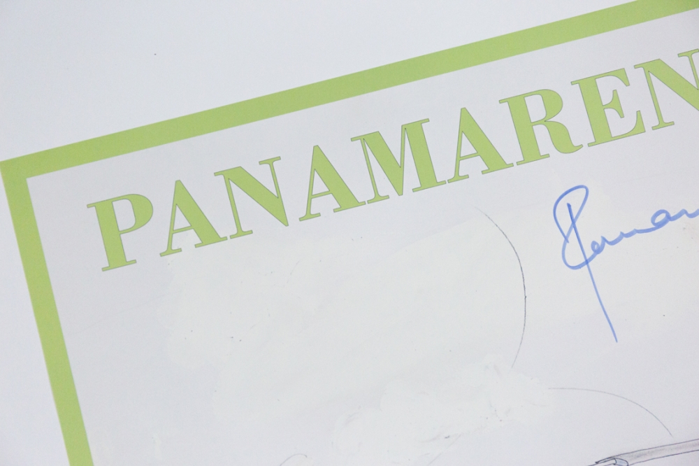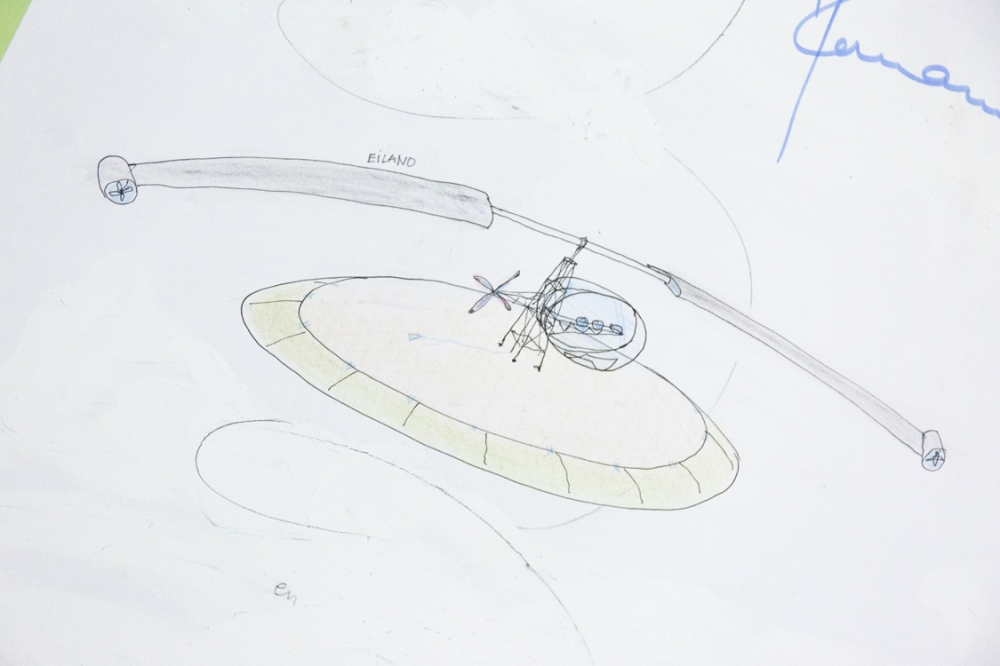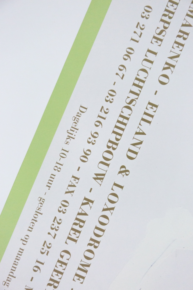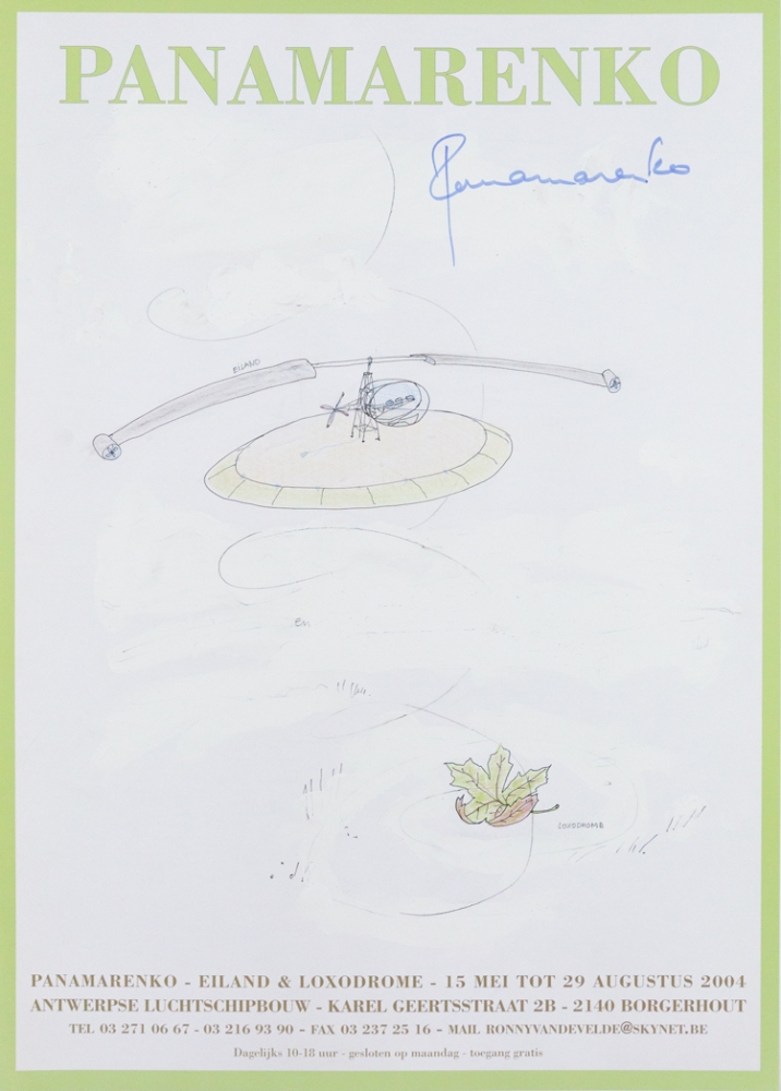 Affiche voor de expositie Eiland & Loxodrome, waarop een tekening is afgebeeld van Panamarenko's Vliegend Eiland. Met de hand gesigneerd door de kunstenaar.