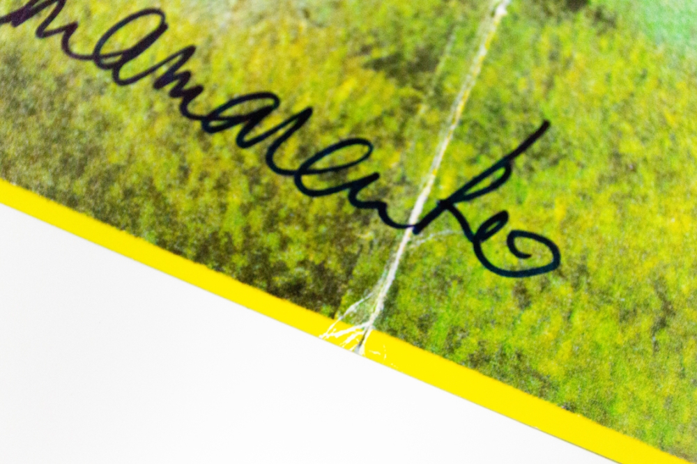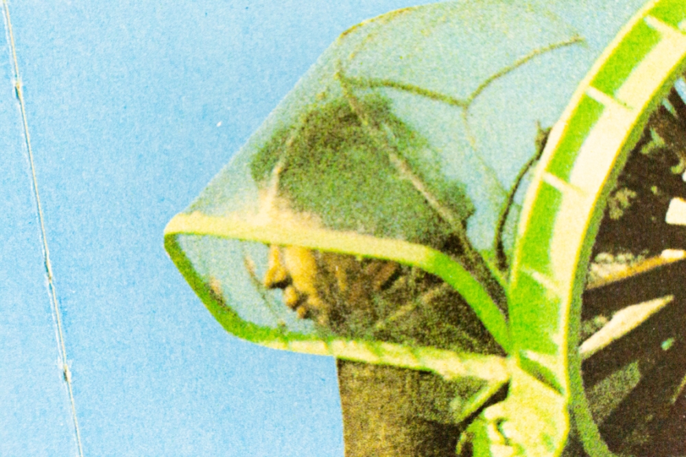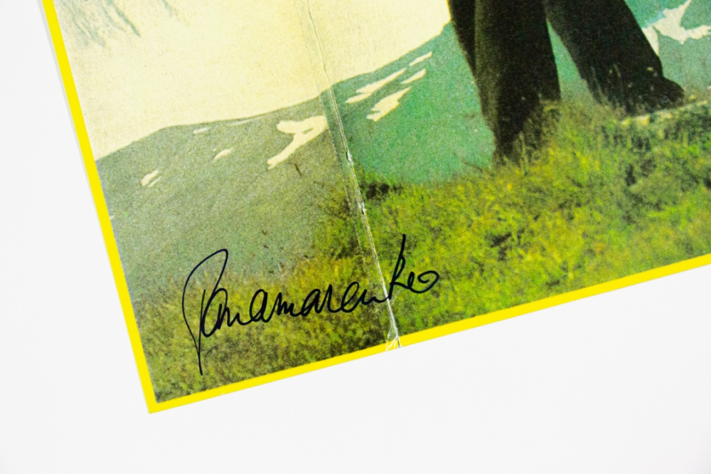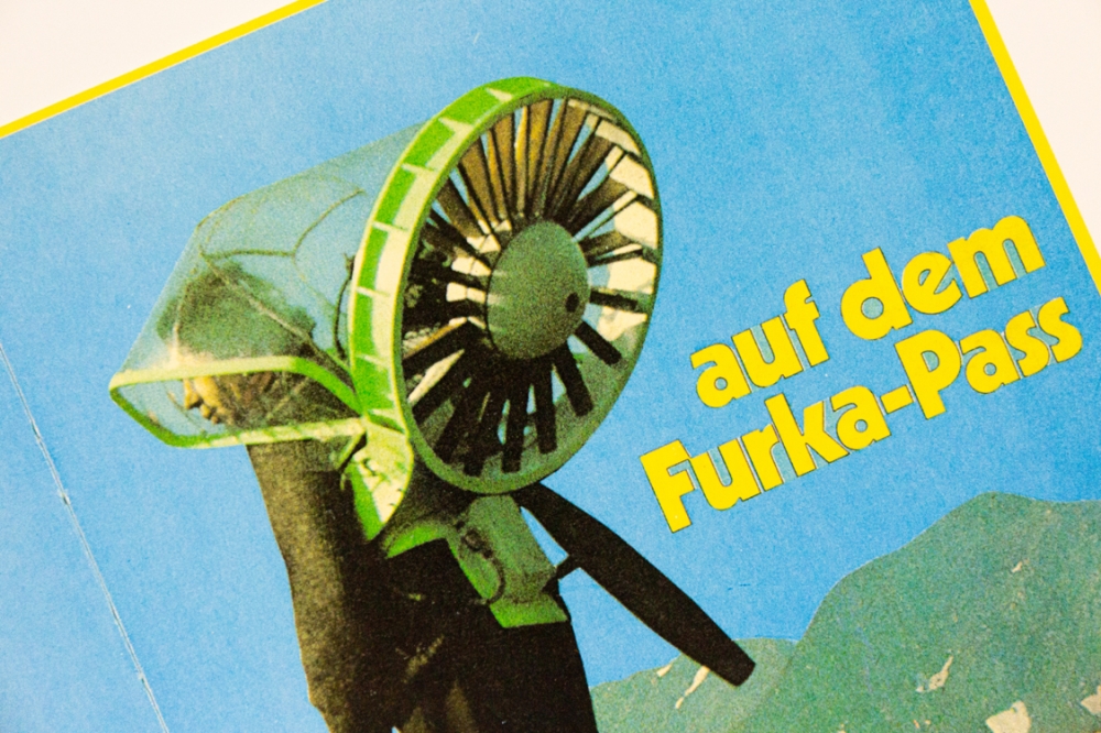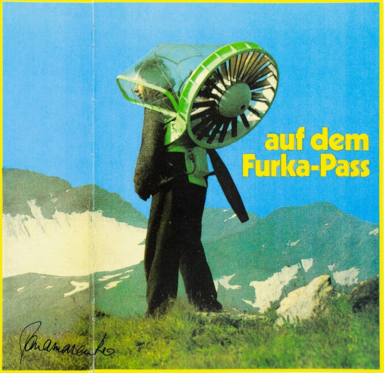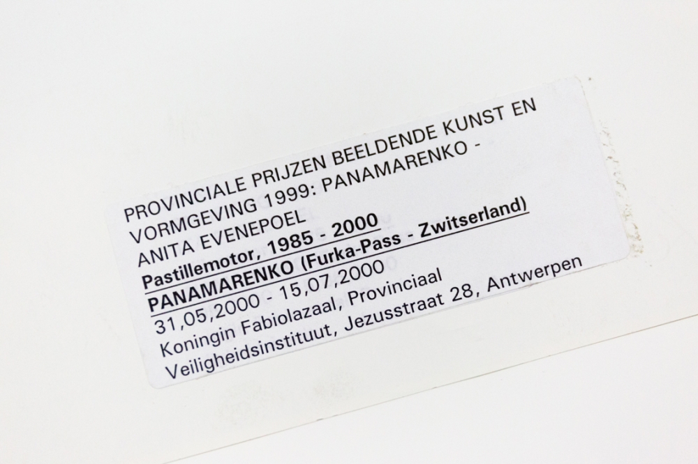 The origin or use of the card is unclear, but it is linked to the five-yearly Provincial prize for visual art in Antwerp, which Panamarenko received as a reward for 30 years of passion in the development of his oeuvre. The card shows Panamarenko in Switzerland , with a pastille motor on his back. The card is signed by the artist.