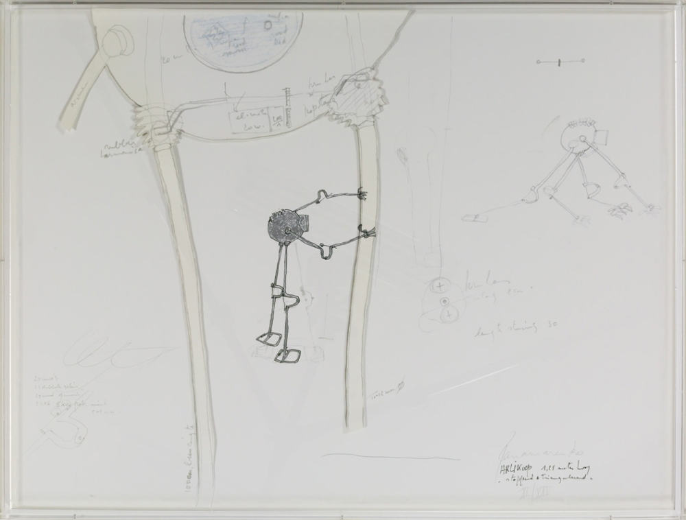Collage by Panamarenko, based on a lithograph that has been partly colored by hand. Some parts of the arlikoop are mounted in an elevated position and the work is in a new, unused plexibox.