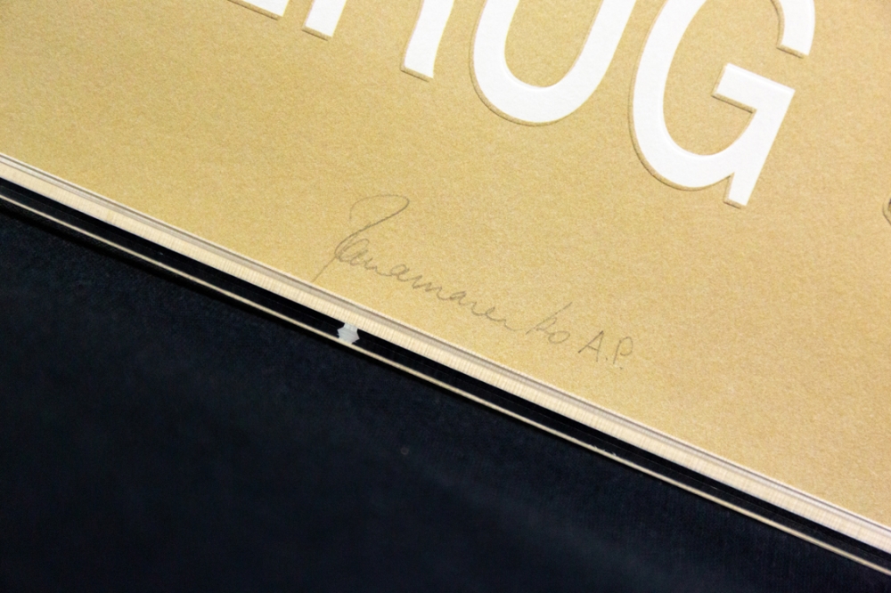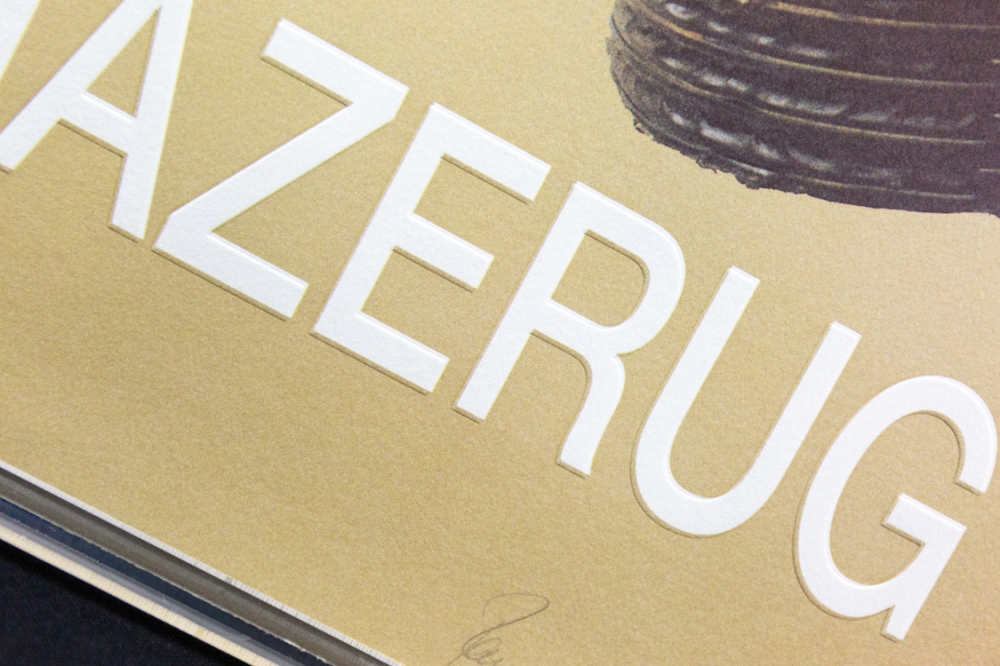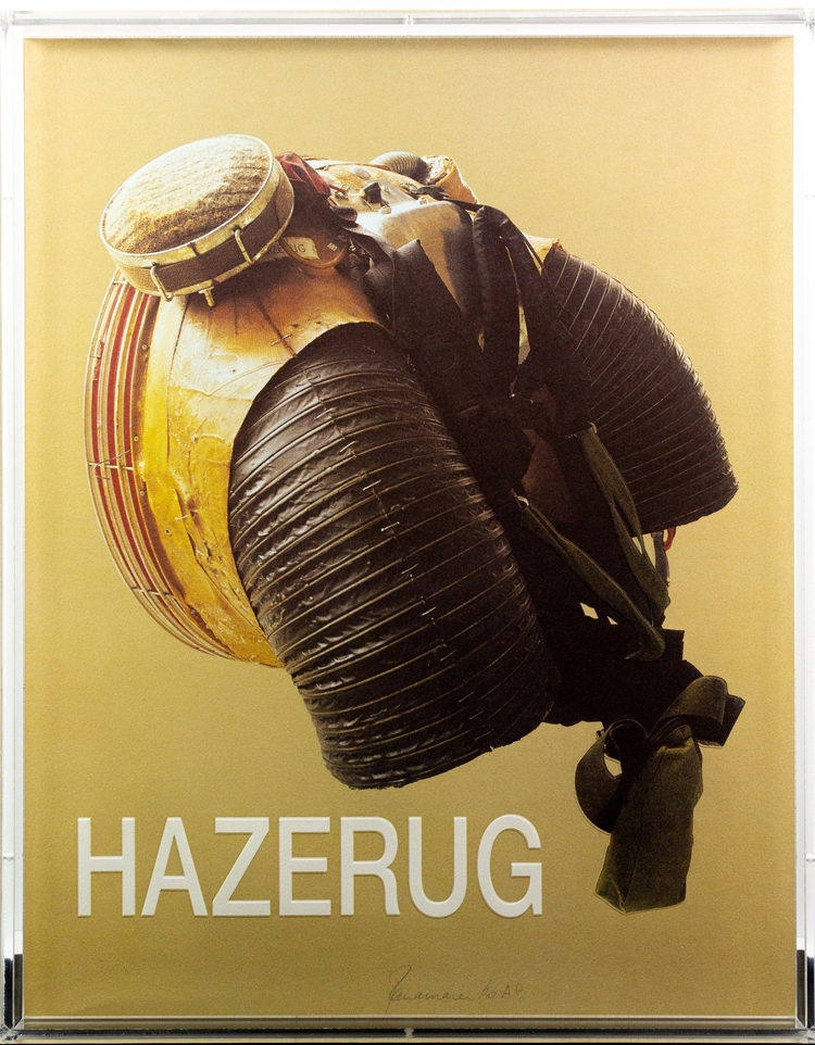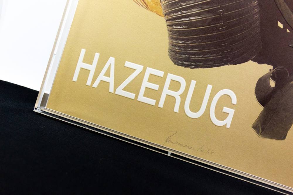 Kleurenoffsetdruk met diepdruk op bepaalde delen (de straps en de letters "HAZERUG"). Met de hand gesigneerd door de kunstenaar.