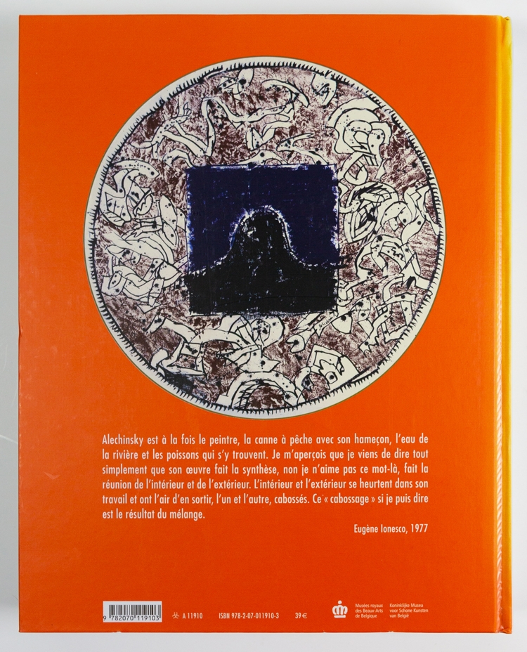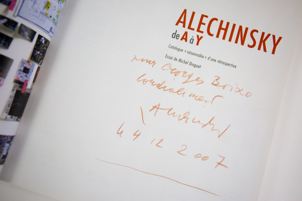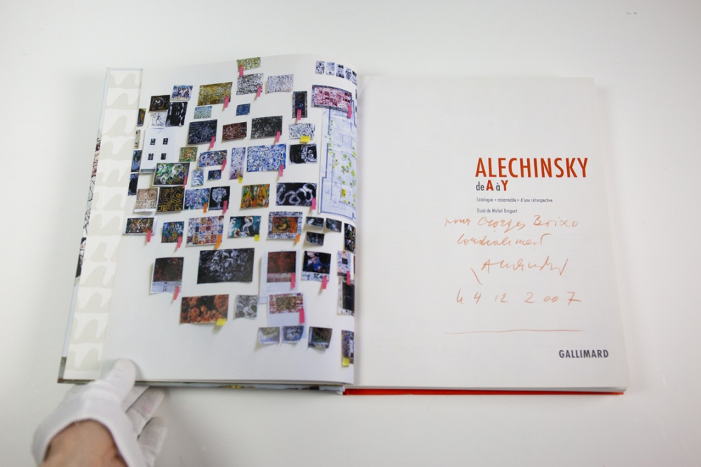 Book about Pierre Alechinsky entitled "Catalog raisonnable d'une retrospective". The book is signed and dated by hand. The artist also wrote down a personal message.