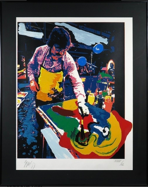 Grote zeefdruk, getiteld Sunday, uit de serie Seven Summer Days. De befaamde portfolio "Seven Summer Days” bevat 14 werken. Karel Appel realiseerde voor elke dag van de week twee werken, waarvan telkens een vrij persoonlijk werk (veelal een zelfportret) genoemd naar de dag, en een werk van een hoofd/figuur in 7 verschillende kleuren/uitvoeringen. Literatuur: Karel Appel, Henk van der Vet, Christian Dotremont, van Spijk uitgeverij, 1991.