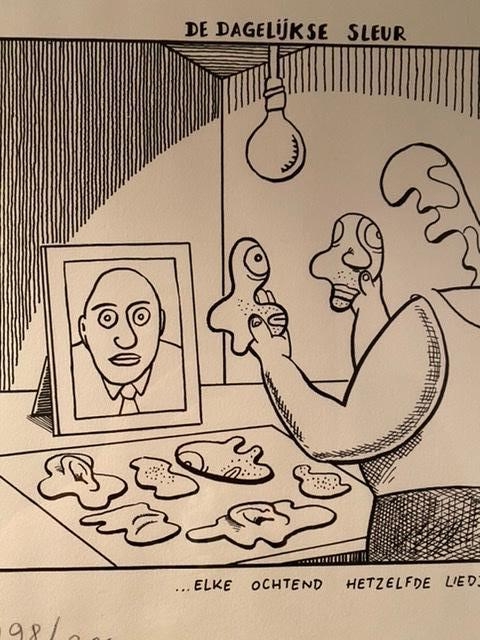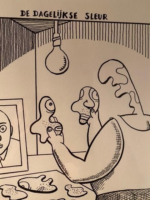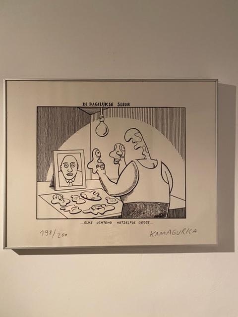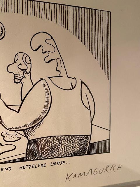 Very nice and absurd screen print by the Belgian artist Kamagurka. The work is neatly set in an aluminum frame. Signed by hand. The work measures 39 x 50 cm. From 1990 and in perfect condition.