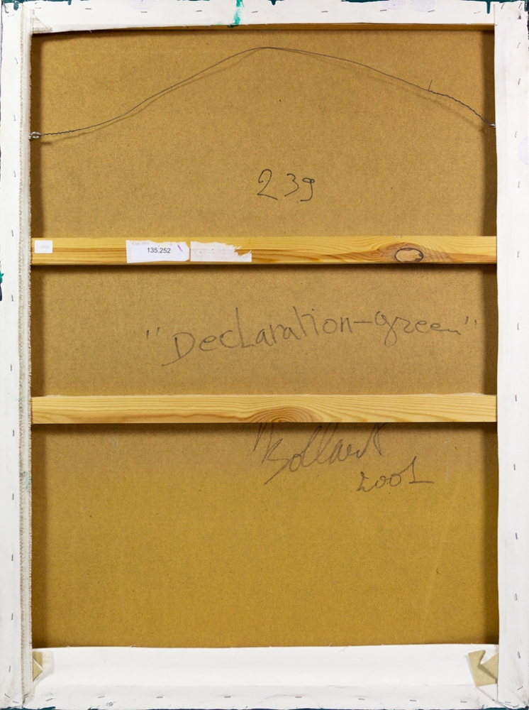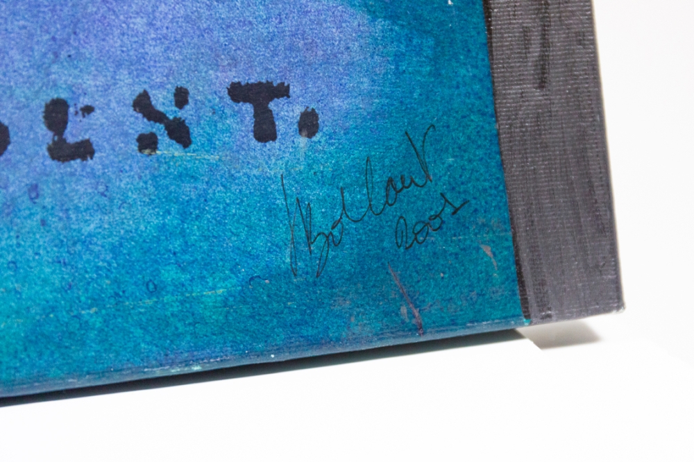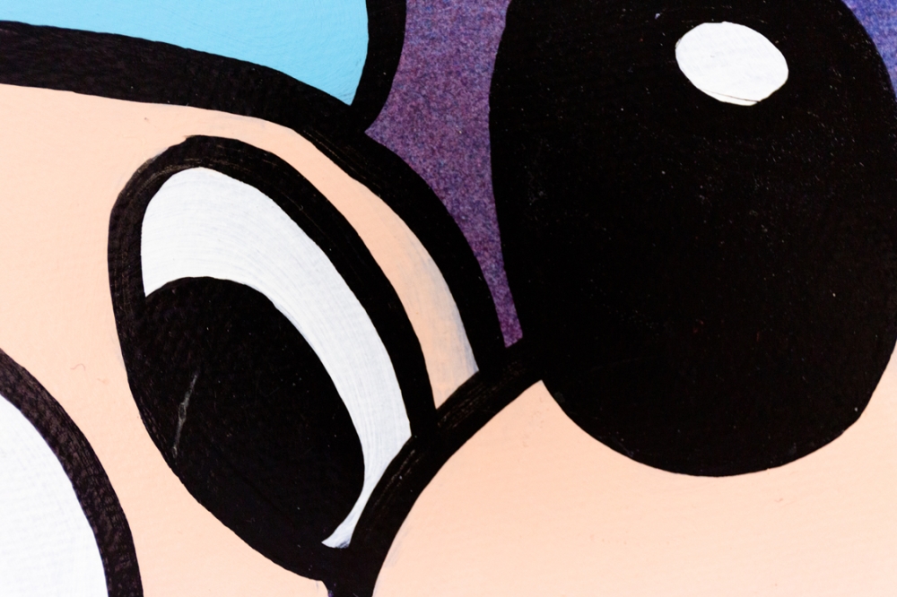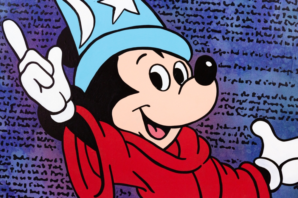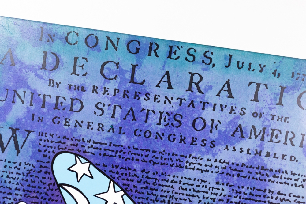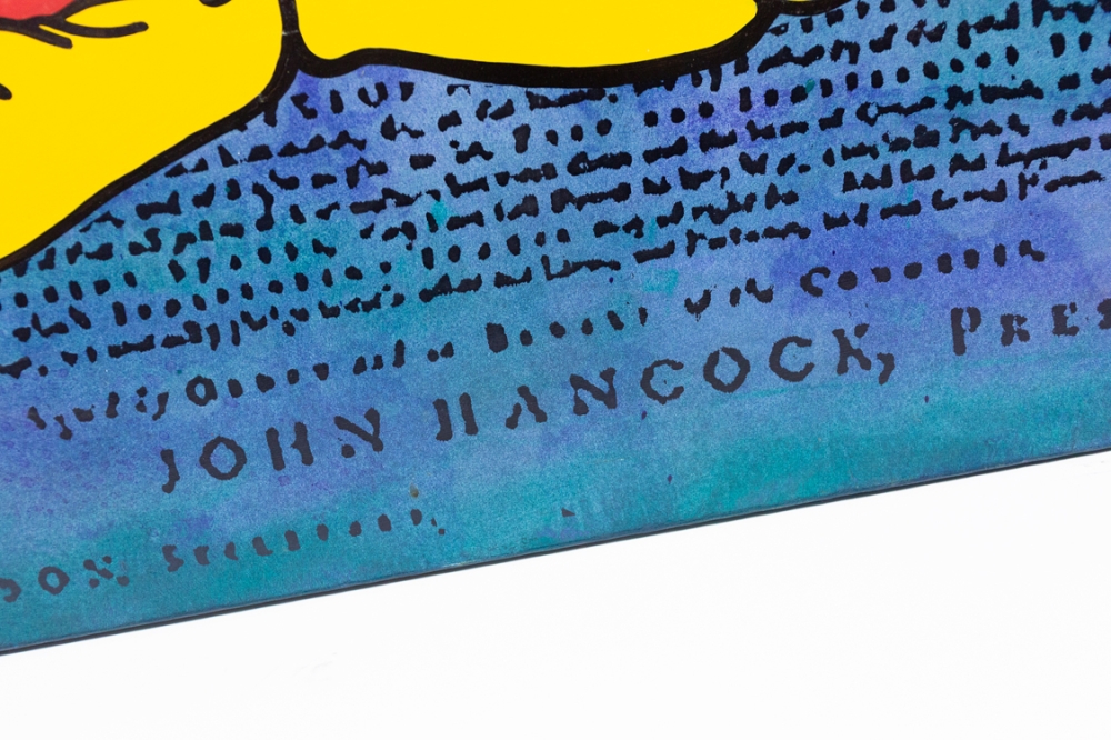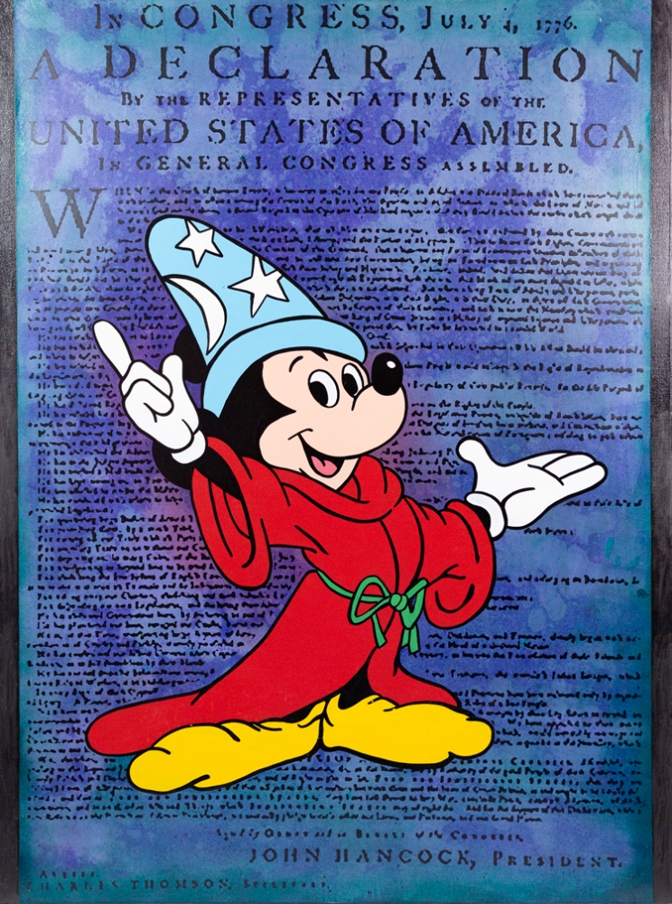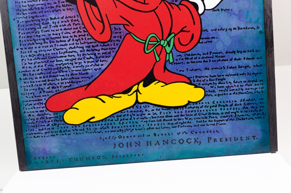 Mixed technique of acrylic on paper, glued on canvas and stretched over panel by Jan Bollaert from 2001. The mickey mouse character is painted / colored with acrylic paint. In the background is the US Declaration of Independence