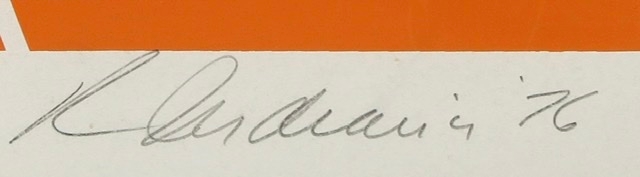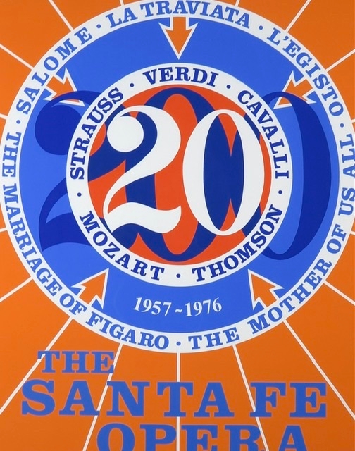 Grote helder gekleurde zeefdruk, door Robert Indiana ontworpen en met de hand gesigneerd en genummerd. Indiana heeft deze voorstelling ontworpen voor het 20-jarig bestaan van The Santa Fe Opera. Deze zeefdruk is ook als, ongenummerd, affiche uitgegeven waarbij het wit vervangen werd door zilver.