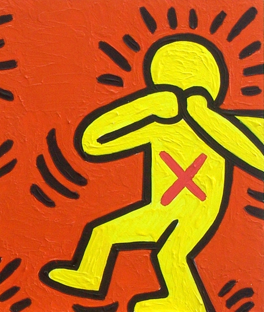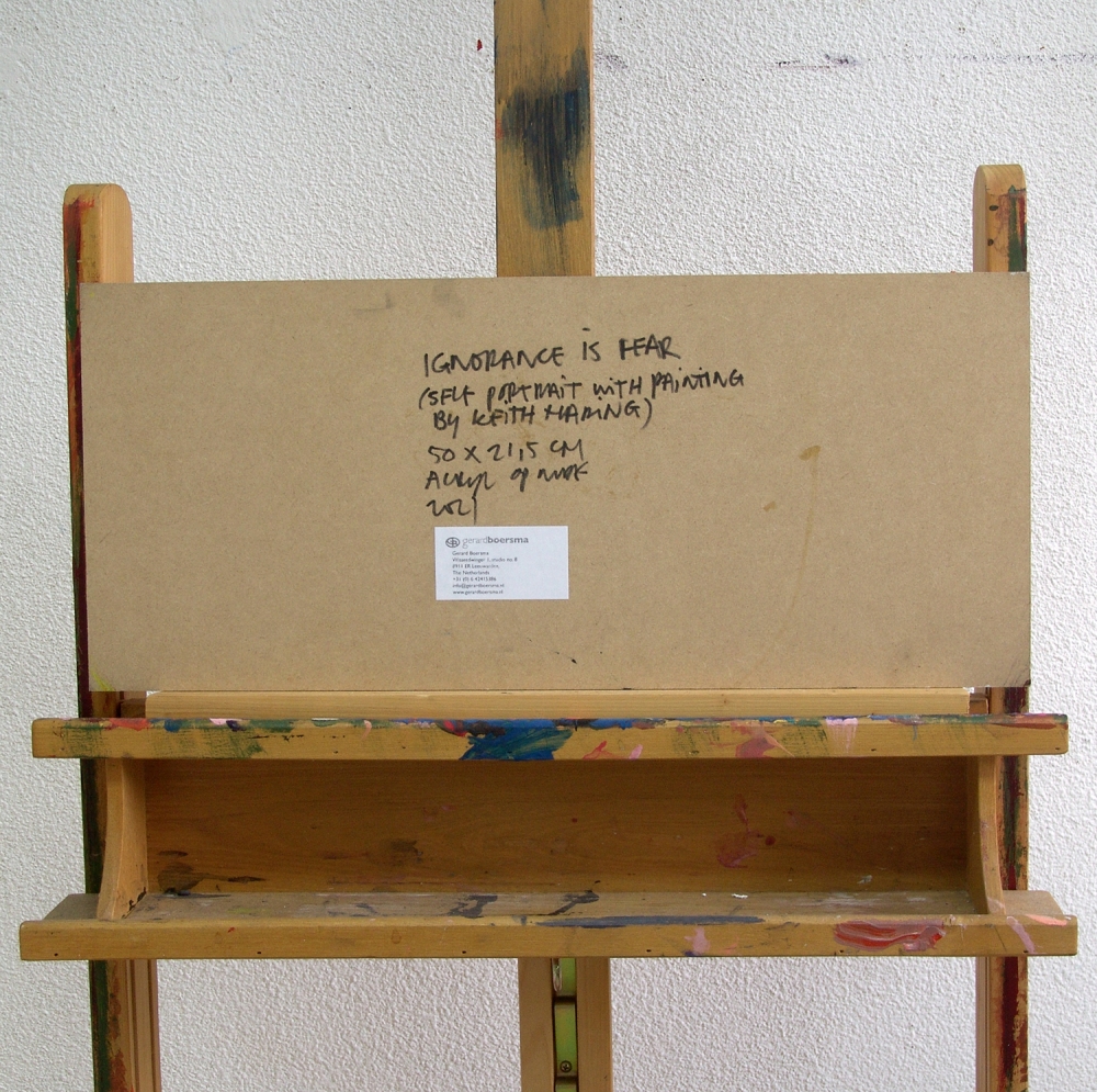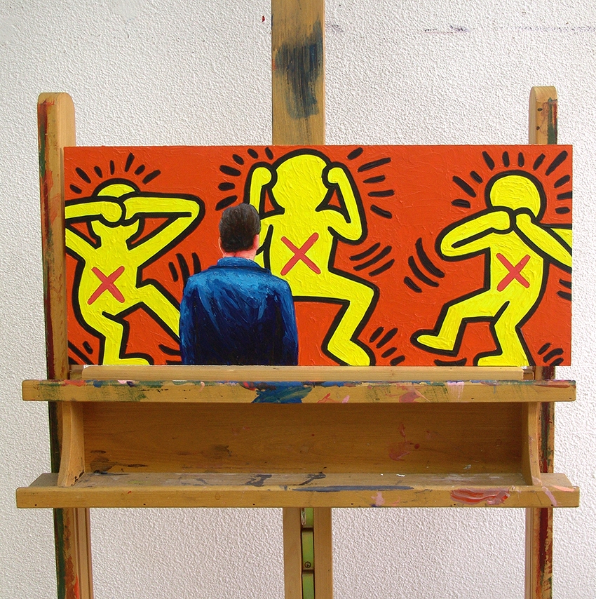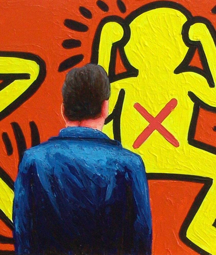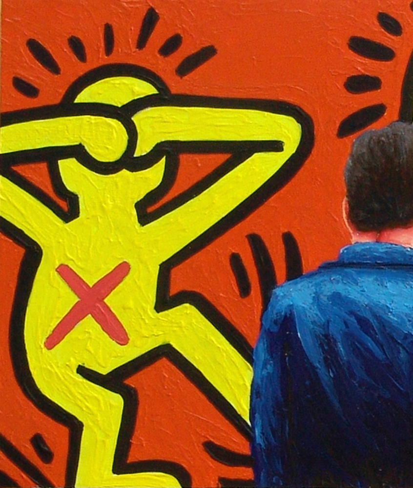 Gerard Boersma is known for his paintings of people looking at famous paintings in museums. This 50 x 21.5 cm work shows the artist himself looking at a painting by Keith Haring. The work dates from 2021 and is made with acrylic on mdf. Signed on the back. The painting is labeled by the artist and comes with a certificate of authenticity.