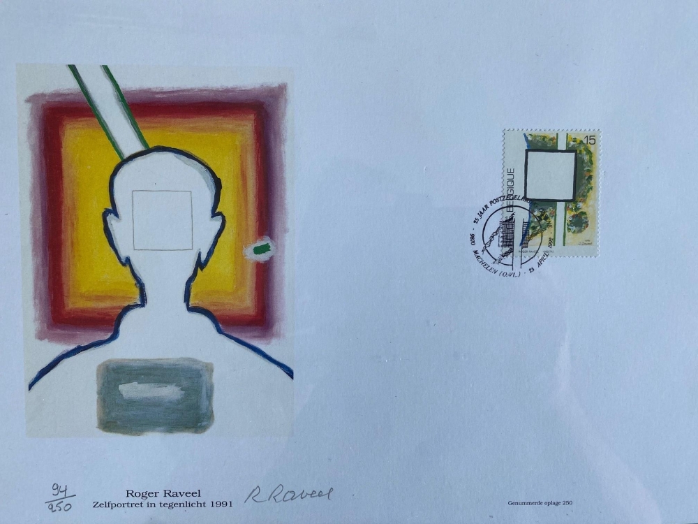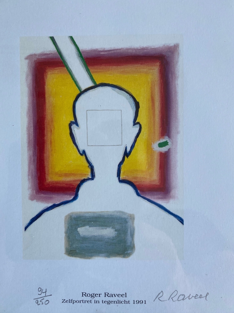 A stamp designed by Roger Raveel applied to an offset print of "Backlit Portrait".