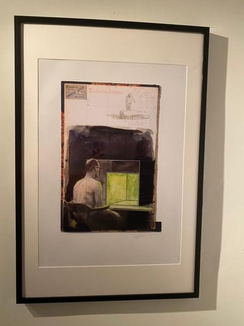 The work is framed in a black frame, not with glass but with a plexi plate.