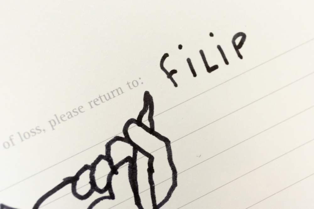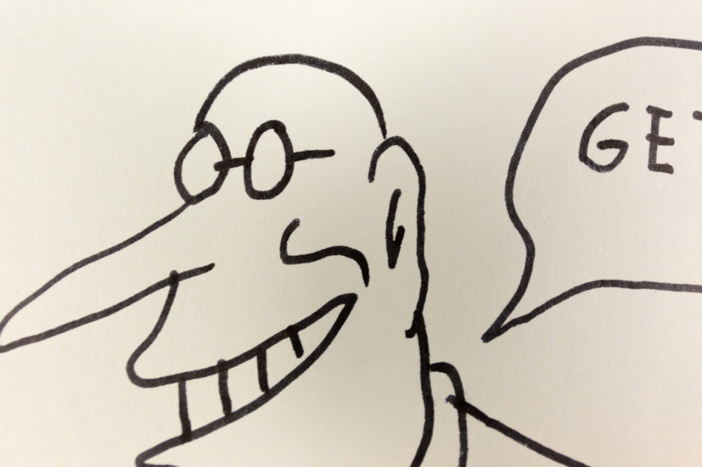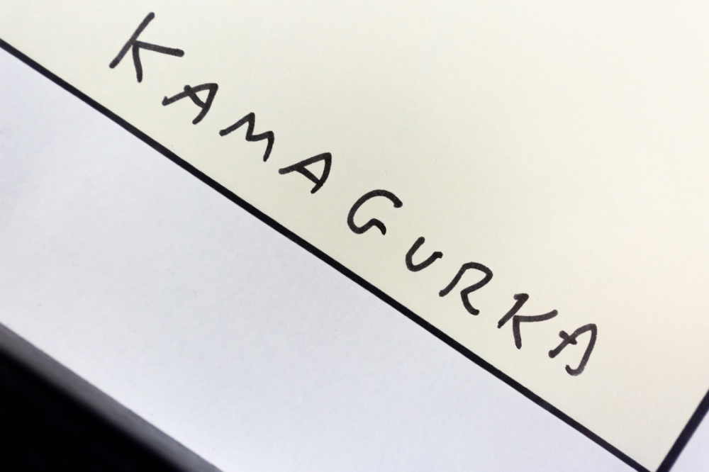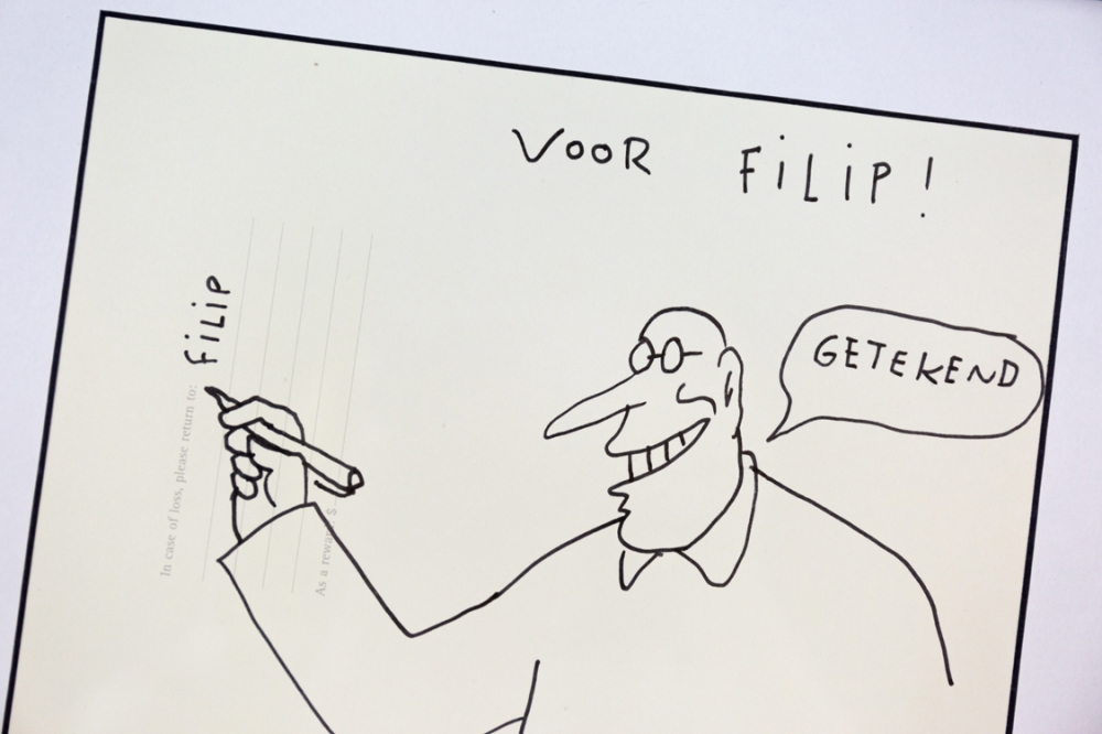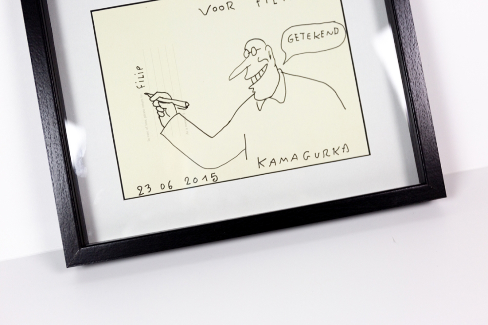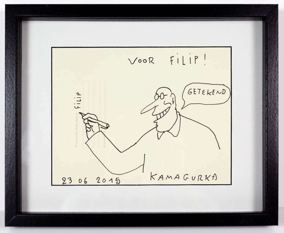 Originele tekening op papier van Kamagurka. Ingelijst in een sober zwarte kader met witte passe-partout en een zwart randje.