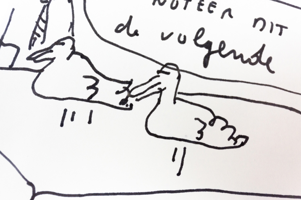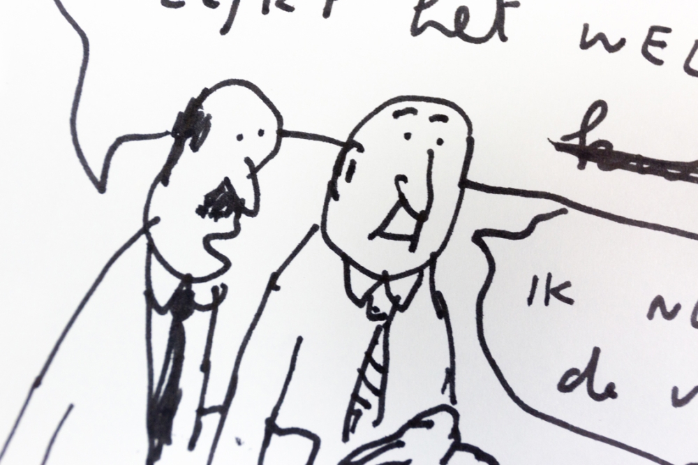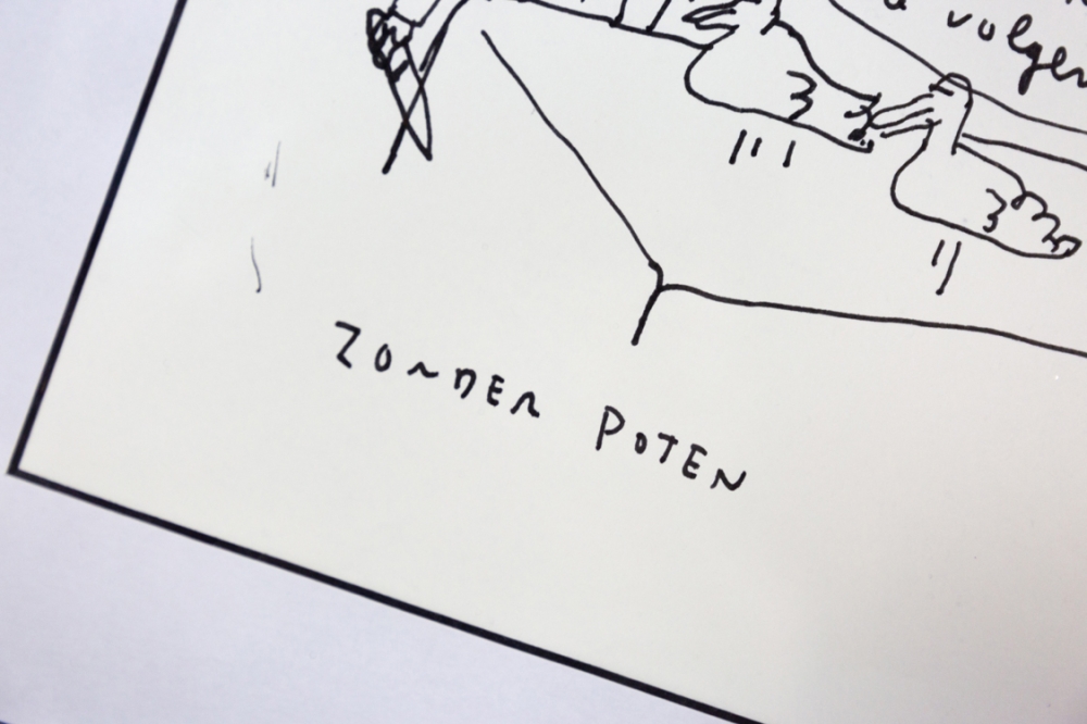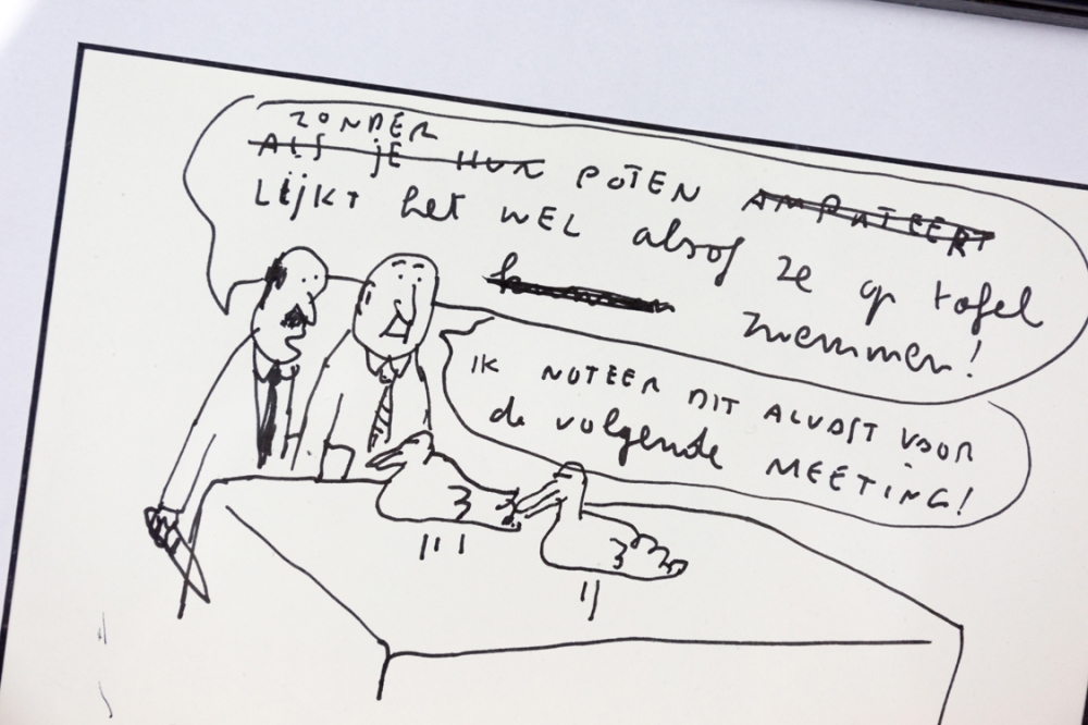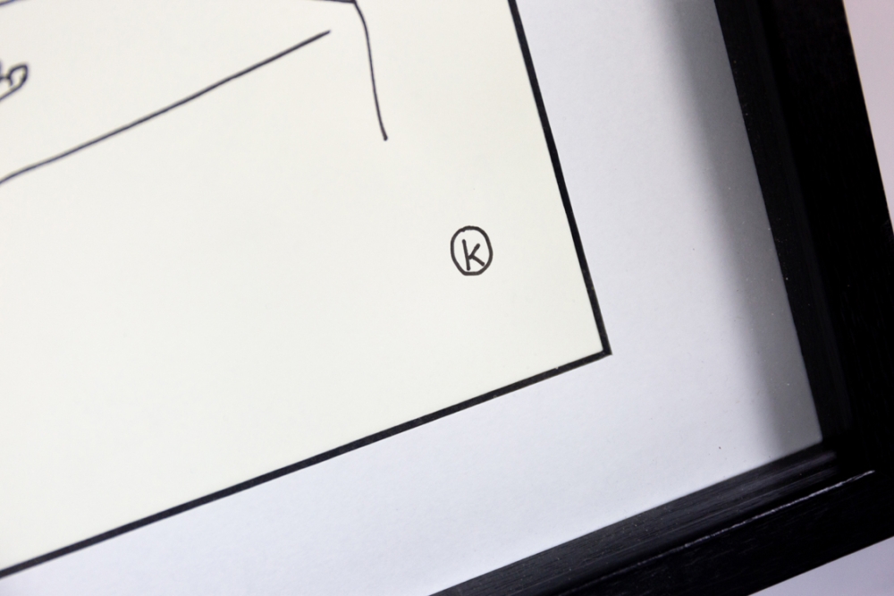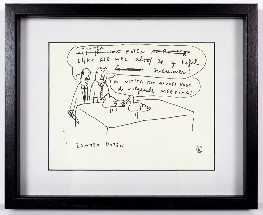 Originele tekening op papier van Kamagurka. Ingelijst in een sober zwarte kader met witte passe-partout en een zwart randje.