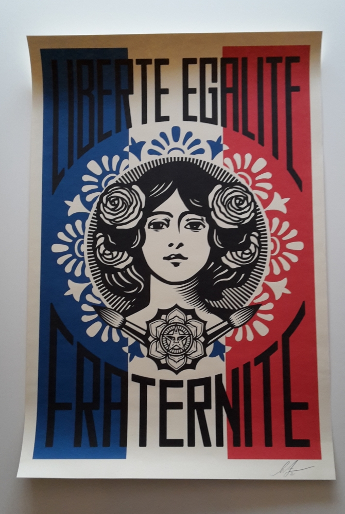 An original litho 'Liberté Egalité Fraternité' by the world-renowned US based artist Shepard Fairey aka "Obey Giant". Offset Lithograph on Cream Speckle Tone Paper Open Edition. Signed and dated 2021 by the hand of the artist. This print measures 61.0 x 91.4 cm (24 x 36)(WxH). In excellent condition. Sold without frame. Shepard - I created the Liberté, Egalité, Fraternité art piece to show support for France after the Nov. 13, 2015 terror attacks. The piece was very important to me as a symbol of unity during a dark, tragic moment. I was moved that the art and the message was inspiring for so many people in France, and beyond, and it has remained one of my most requested images since it was first created. Im excited to be releasing it now as an open edition offset print, accessible for all.