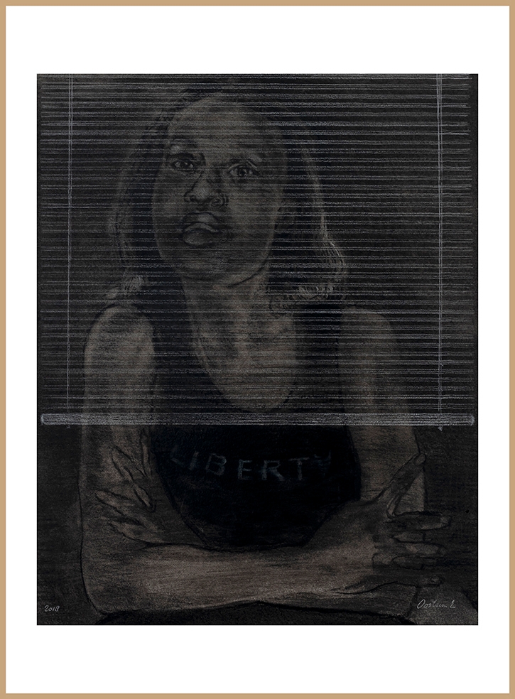 Liberty is een gemengde techniek op papier. houtskool en verf. combinatie van tekenen, schilderen en airbrush. Het is een donker getinte vrouw met liberty op haar T shirt. De luxaflex is half open of misschien wel half dicht. Een actueel onderwerp. De gelijkheid van mensen met een andere huidskleur en in het de bijzonder de vrouwen met een andere huidskleur. Het werk is ingelijst in een hout kleurige lijst met glas. Het is nu normaal glas. Het is een donker werk wat zeker nog beter uitkomt als men het glas vervangt voor museum glas. De buiten maat van de lijst is: 70 x 60 cm. Recent werkt Lambert meer abstract met af en toe wat figuratie. In 2018 is hij genomineerd voor de Herman Krikhaarprijs in Almelo . Het schilderij van de nominatie heet: Fresh Product Het een en ander is te lezen op zijn website: www.lambertoostrum.nl