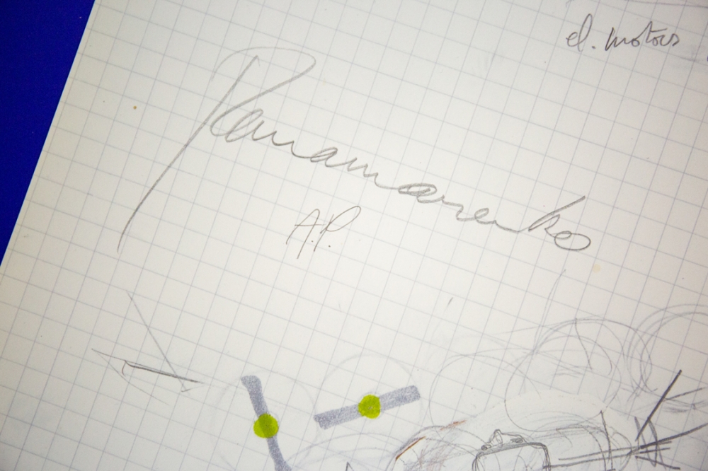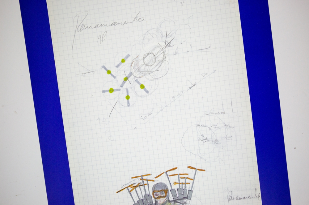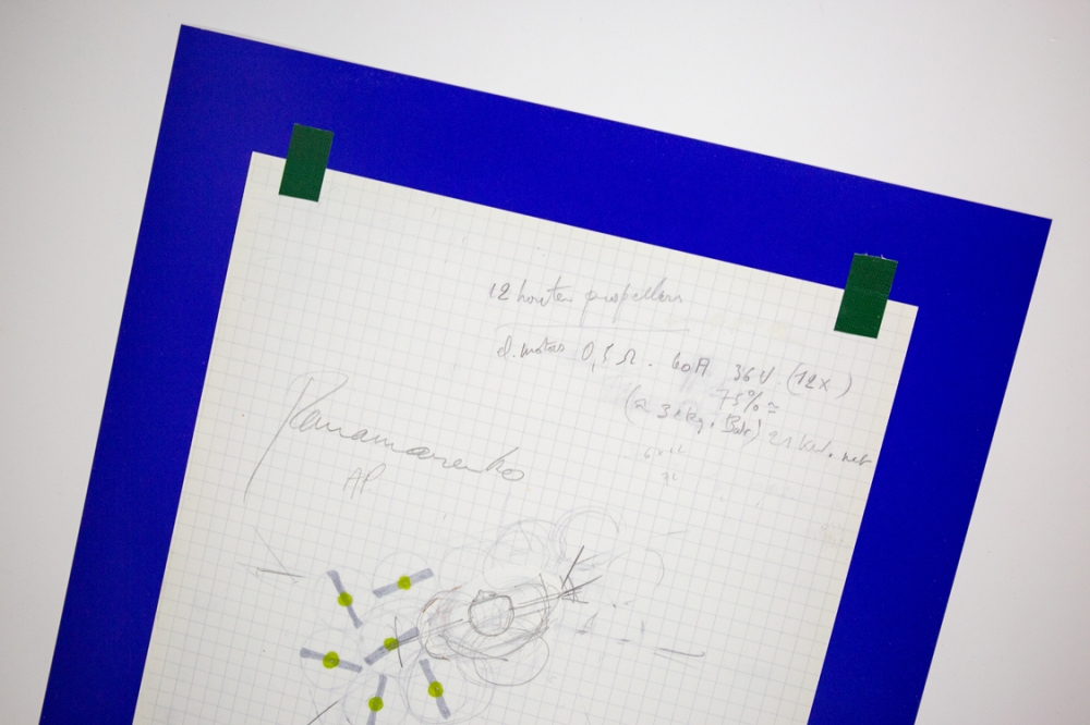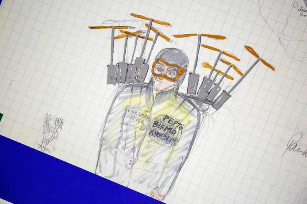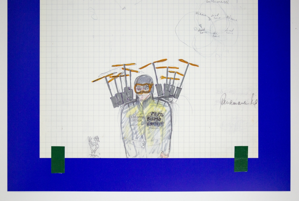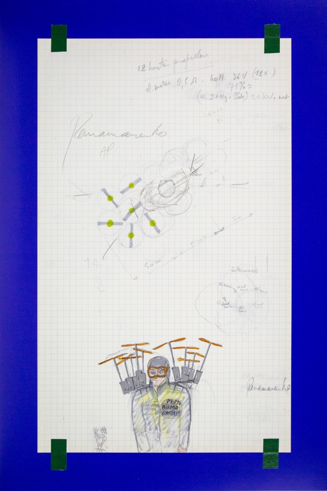 A lithograph by Panamarenko's Pepto Bismo, a high-performance and portable flying device that can be used by the pilot on the back is carried. The title of the flying device is taken from the American drug Pepto Bismol. By omitting the last letter of the name, the new name gets a haunting and at the same time mythical character.