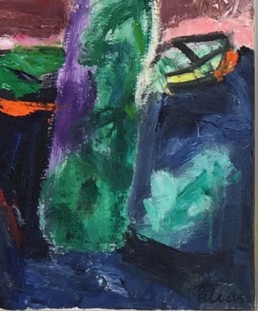 Prachtig, lumineus en expressief werk, zeer representatief voor het globale werk van Etienne Elias Hoewel hij bleef experimenteren, is zijn expressieve kleurrijke figuratie altijd herkenbaar, zeker ook in dit werk. tienne Elias kreeg de Prijs voor de Jonge Belgische Schilderkunst, 1966Retrospectief, PMMK, Oostende, 2005De Deleu-prijs