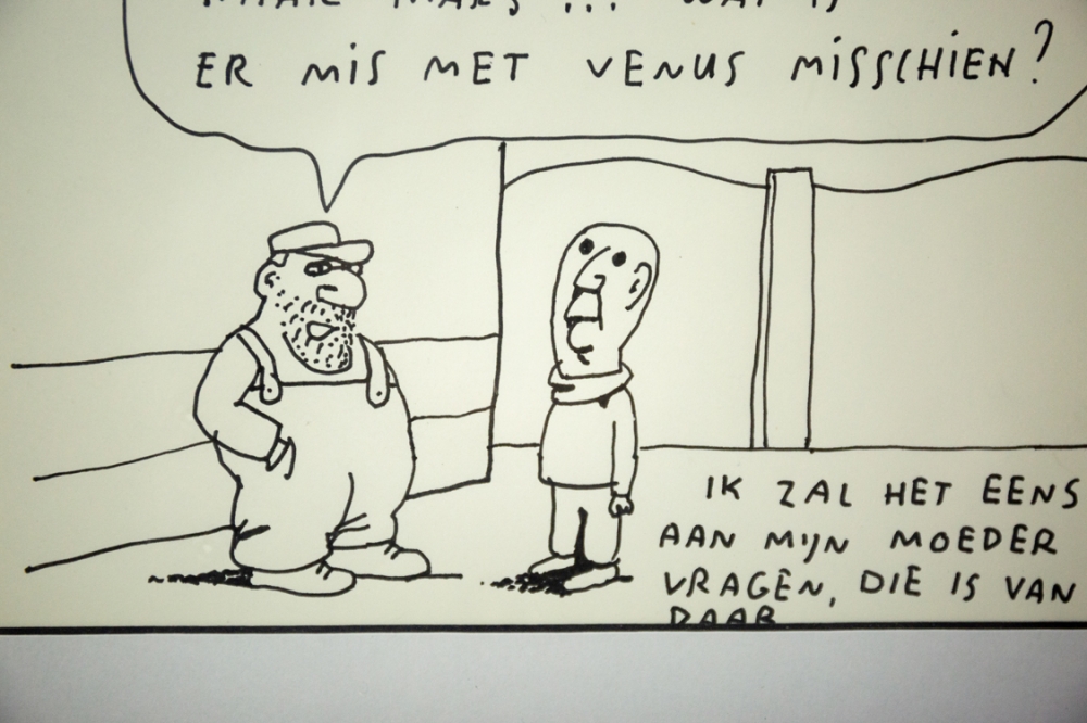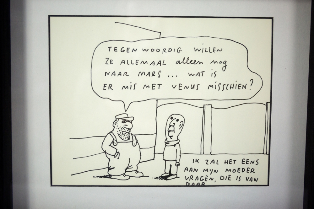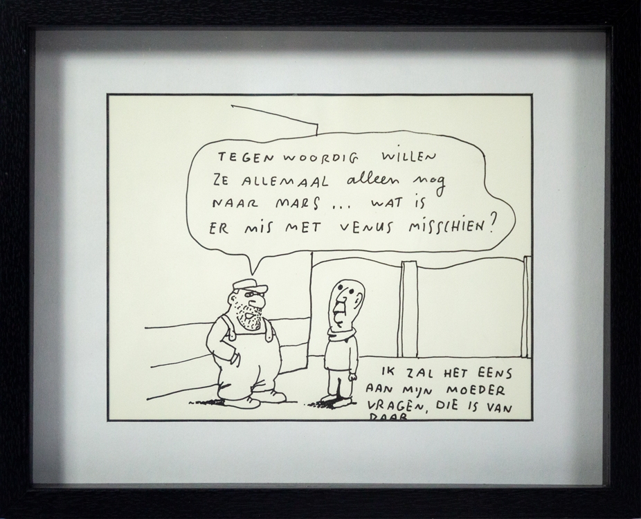 Originele tekening op papier van Kamagurka. Ingelijst in een sober zwarte kader met witte passe-partout en een zwart randje.