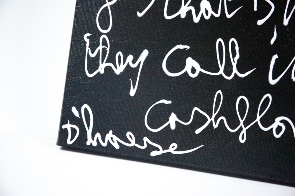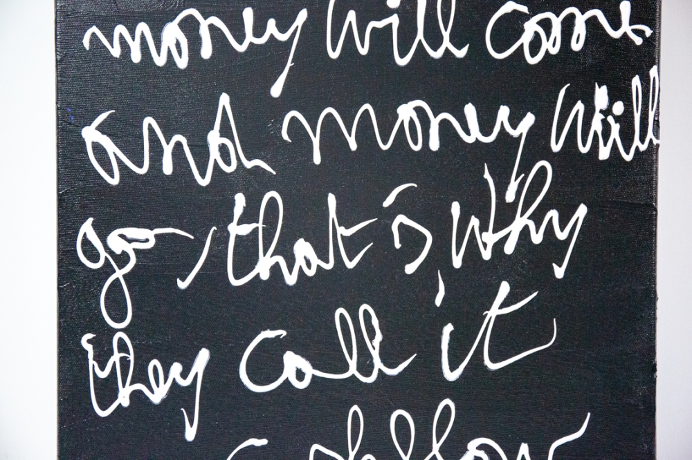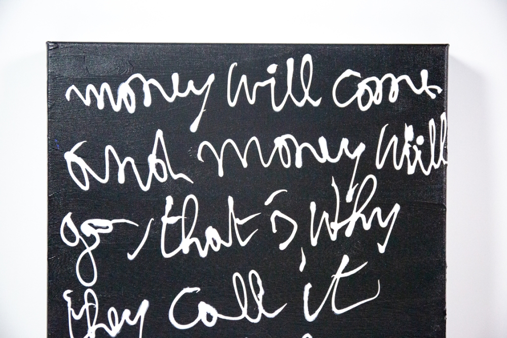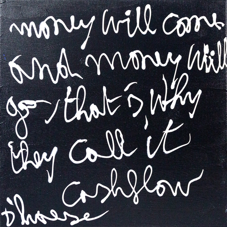 Acrylic painting by Hannes D'Haese, with the inscription "Money will come and money will go, that's why they call it cashflow".