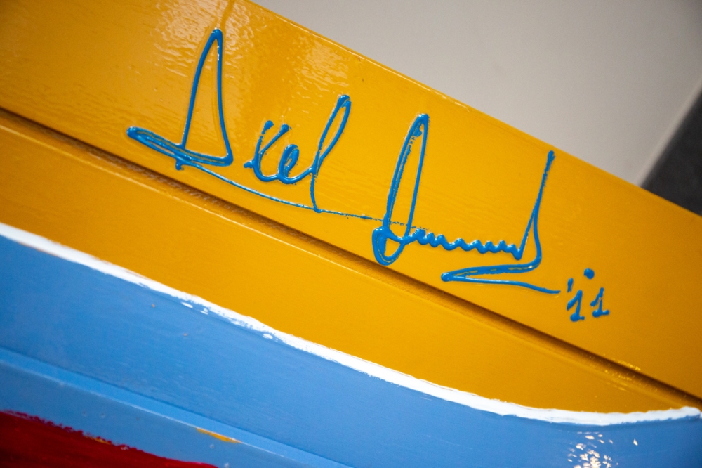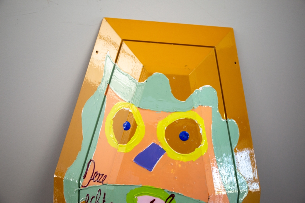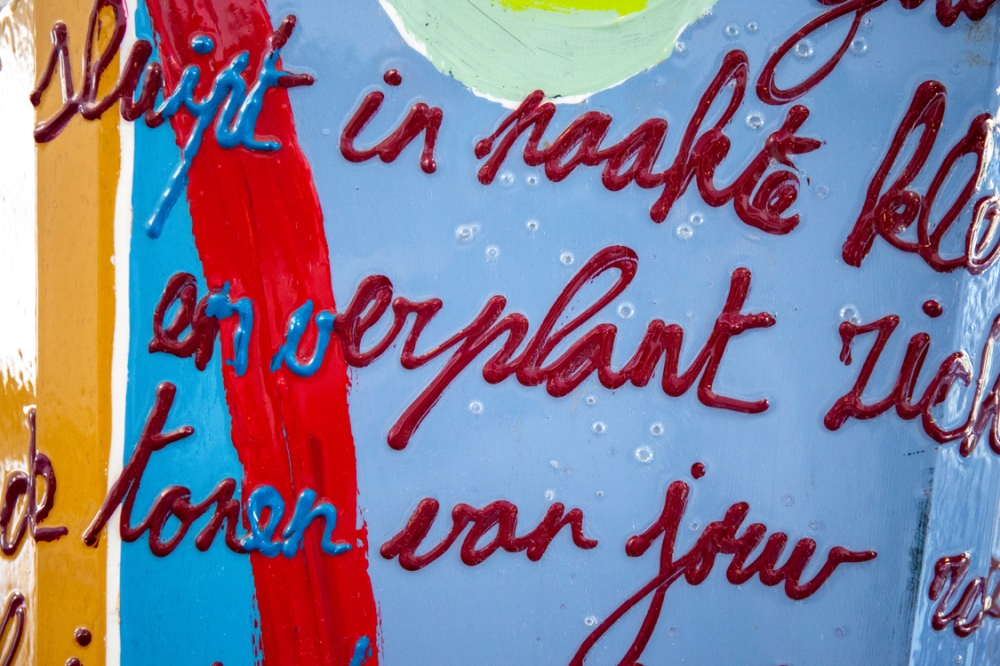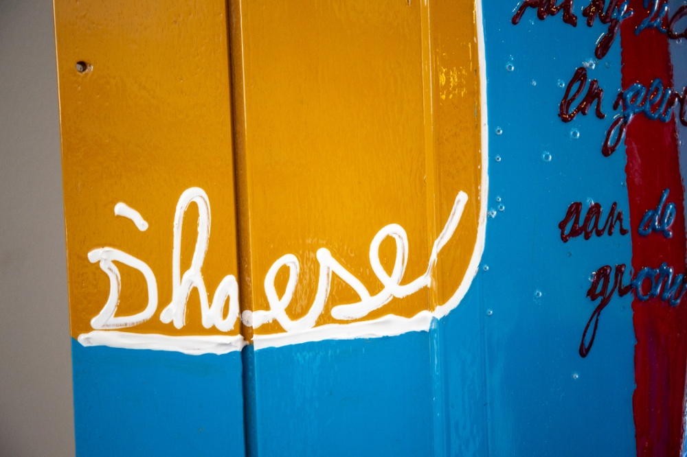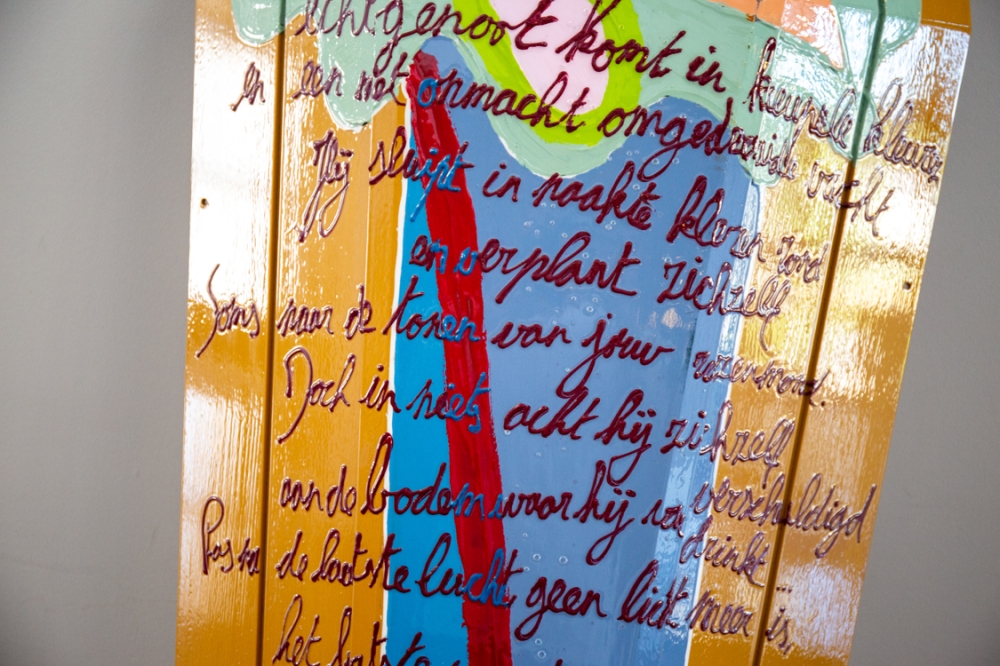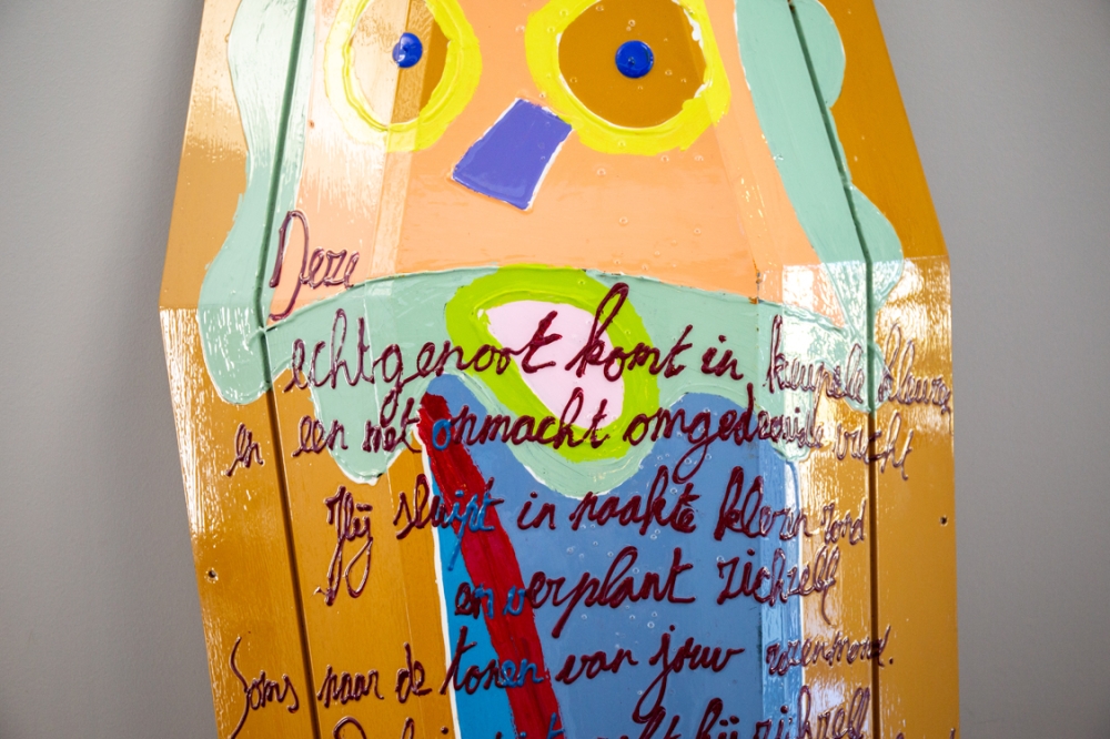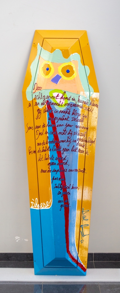 Cover of a coffin painted in acrylic, in collaboration with and a poem by Axel Dhaeseleire.