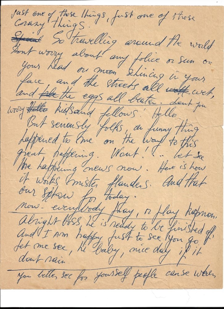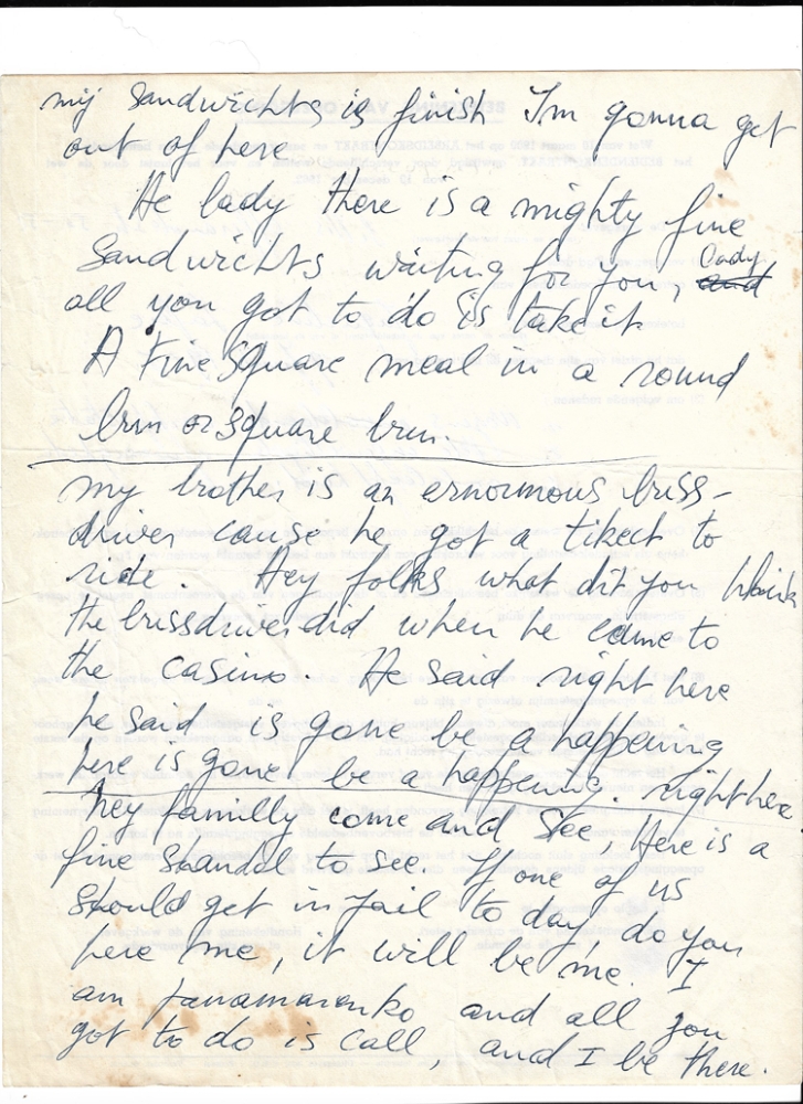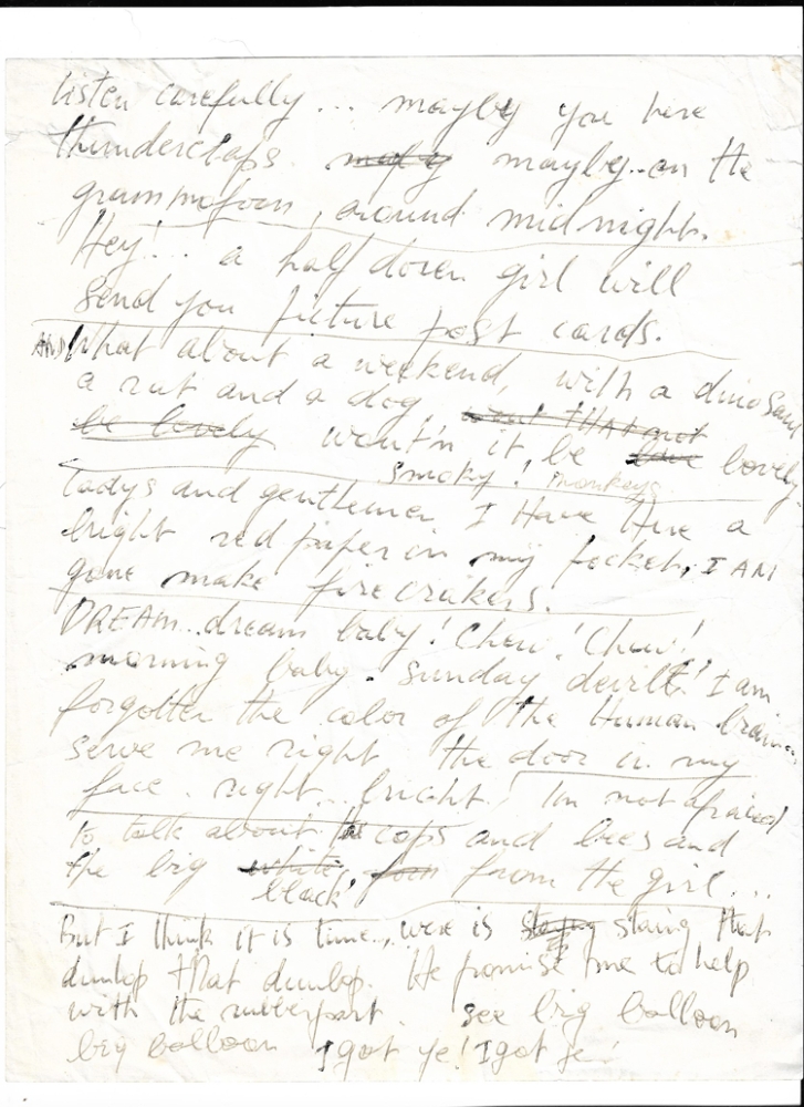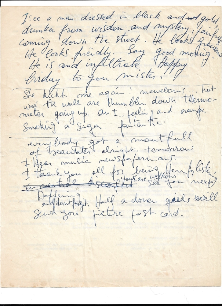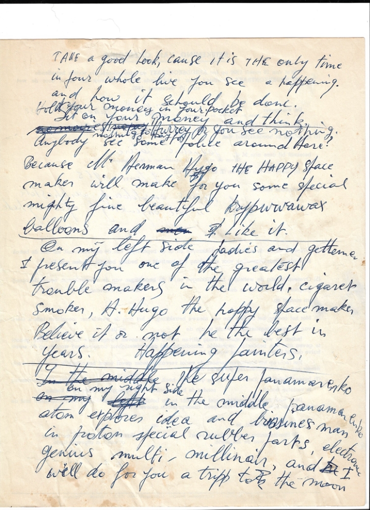 5 letters handwritten by Panamarenko, which come from the collection of Ronny Van De Velde, have been exhibited (see catalogue). Panamarenko wrote the letters in 1965 on the train on the way to happening Ostend. The letters were written on the back of a letter of resignation from one of his mother's shoe store employees.