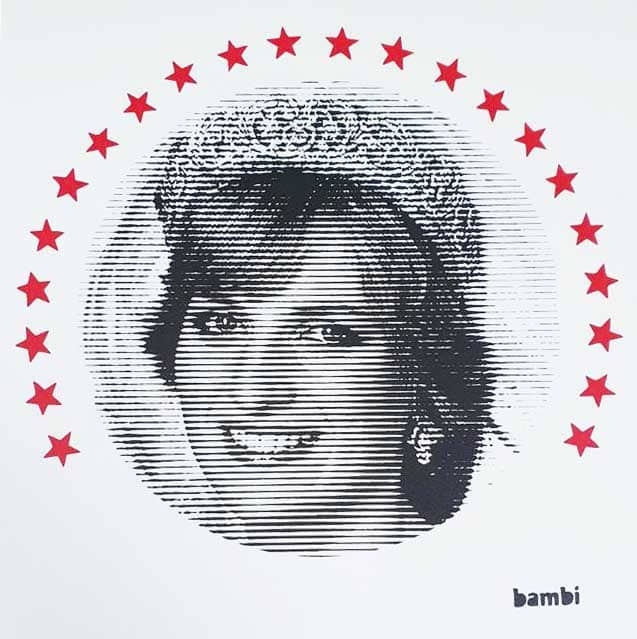 Lady Di – 2-kleuren zeefdruk – Editie van 25 – Handgesigneerd en -genummerd door Bambi – 2020 ‘Lady Di’ is het eerste werk van Bambi's ‘Weapon of Voice’ Wonderful Women series. Bambi: “Dit werk gaat over het versterken van de vrouwelijke stem in een periode waarin vrouwen openlijk worden gepest, ontmenselijkt en bedreigd omwille van hun politieke ideeën", aldus Bambi. 30 x 30 cm COA (Certificate of Authenticity) beschikbaar DEze zeefdruk werd steeds plat bewaard, en wordt ook plat verzonden, met tracking.