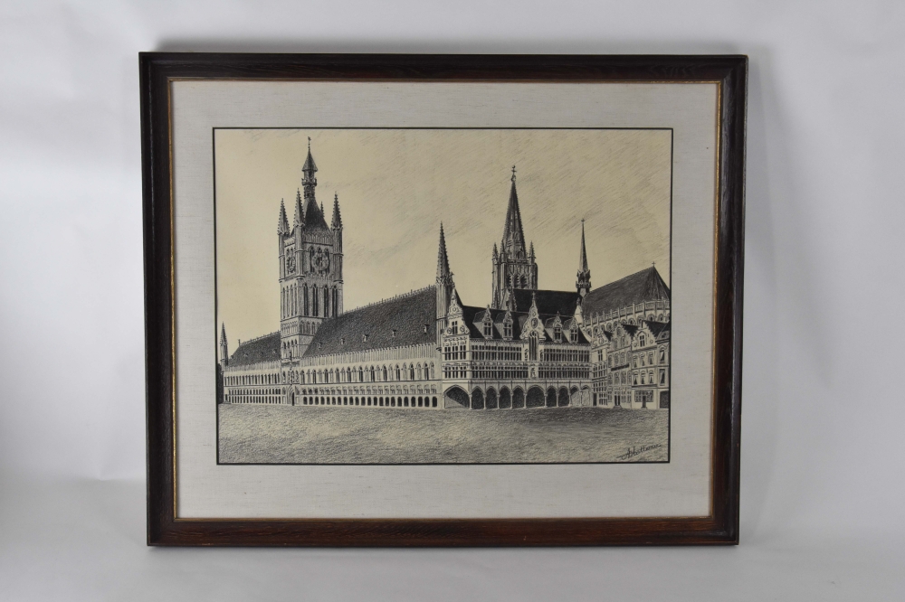 Originele, unieke potloodtekening van Albert Platteau van de gekende Ieperse Lakenhallen.
