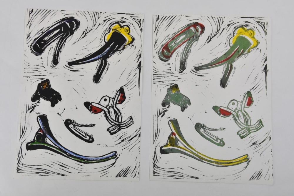 Pieternel mailt: Werken uit mijn opleiding, omdat alle beetjes helpen. Naast de 2 lino-snedes krijg je ook een unieke afdruk op tekenpapier. Ze is oud-leerlinge van de BK-afdeling van de Heilige Familie Ieper.