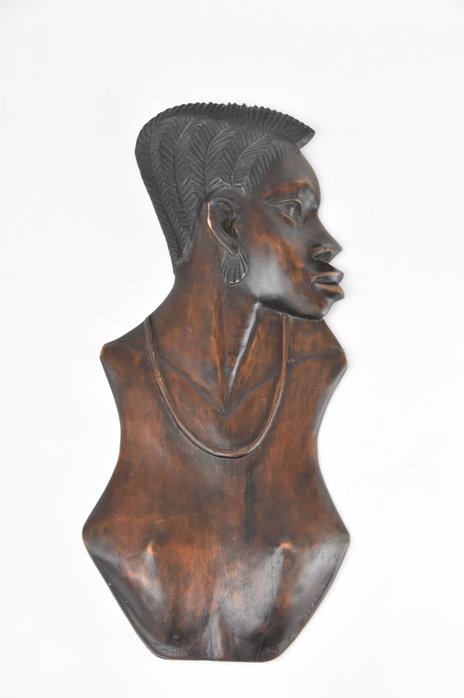 Houtsculptuur meegebracht na bezoek Katako-Kombe waar zusters van de H.-Familie uit Ieper missiewerk deden. Het werk is lichtjes beschadigd aan het oor.