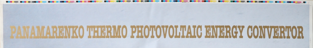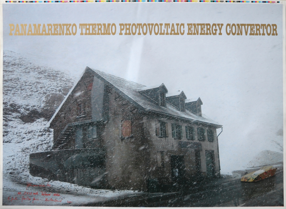 Zeer exclusief poster van de Thermo photovoltaic energy converter. De letters zijn opgehoogd met een blinkende goudkleurig verf. Wat zeer zeldzaam is. De courante poster heeft de goudkleurige letters niet! De poster bevat bovenaan nog de band met drukkleuren. Getekend linksonder in druk. Wordt geleverd met echtheidscertificaat uitgegeven door de PanamarenkoShop.