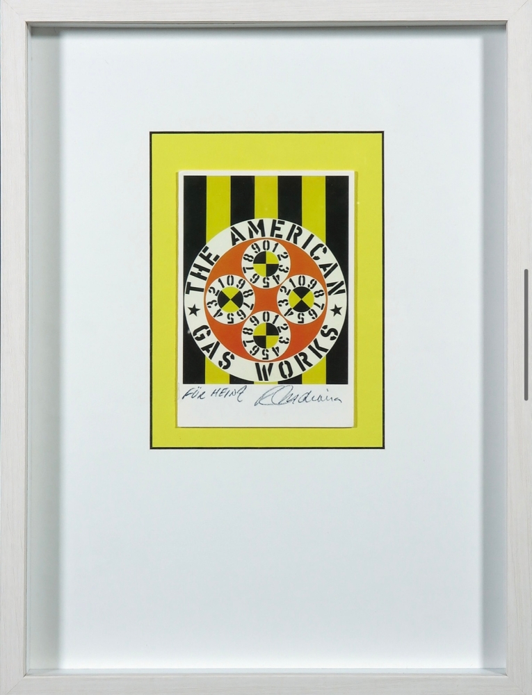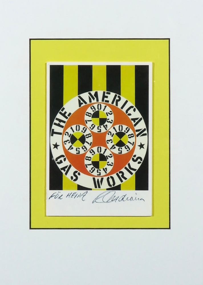 Zeer mooie artcard ontworden door de Amerikaanse kunstenaar Robert Indiana. Het werkje is met de hand gesigneerd en met opdracht aan. De afmetingen zijn 15 x 10,5 cm en de mooie witte lijst meet 41,5 x 31,5 cm