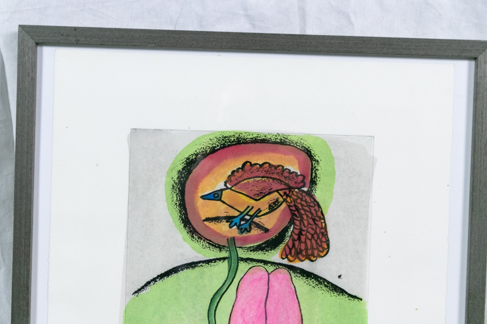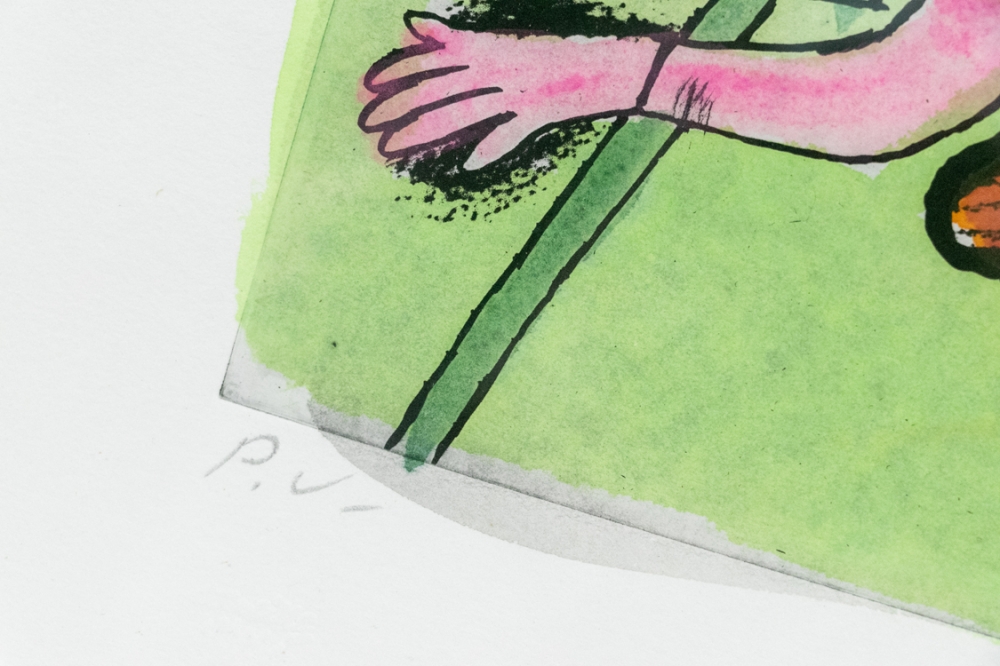 Mixed media ets aangevuld/ingekleurd met waterverf door de kunstenaar. Met de hand gesigneerd en gedateerd door de kunstenaar. Heeft als aanduiding "PU" (Pièce Unique).