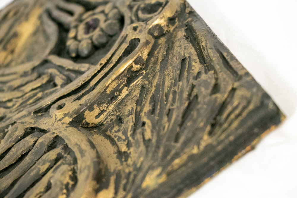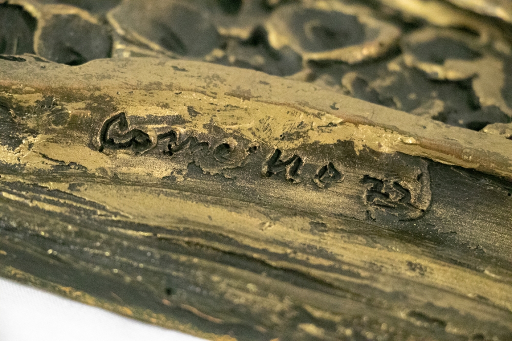 Bas relief in composiet of kunsthars, gemaakt met een bronskleurige uitstraling. Onderaan gesigneerd in het werk, zie laatste foto.