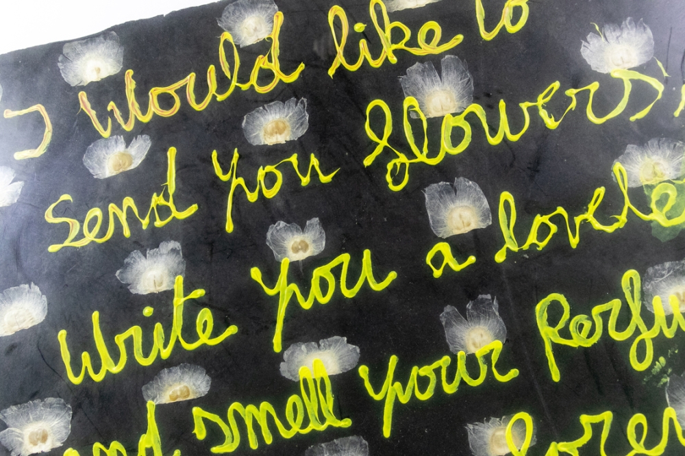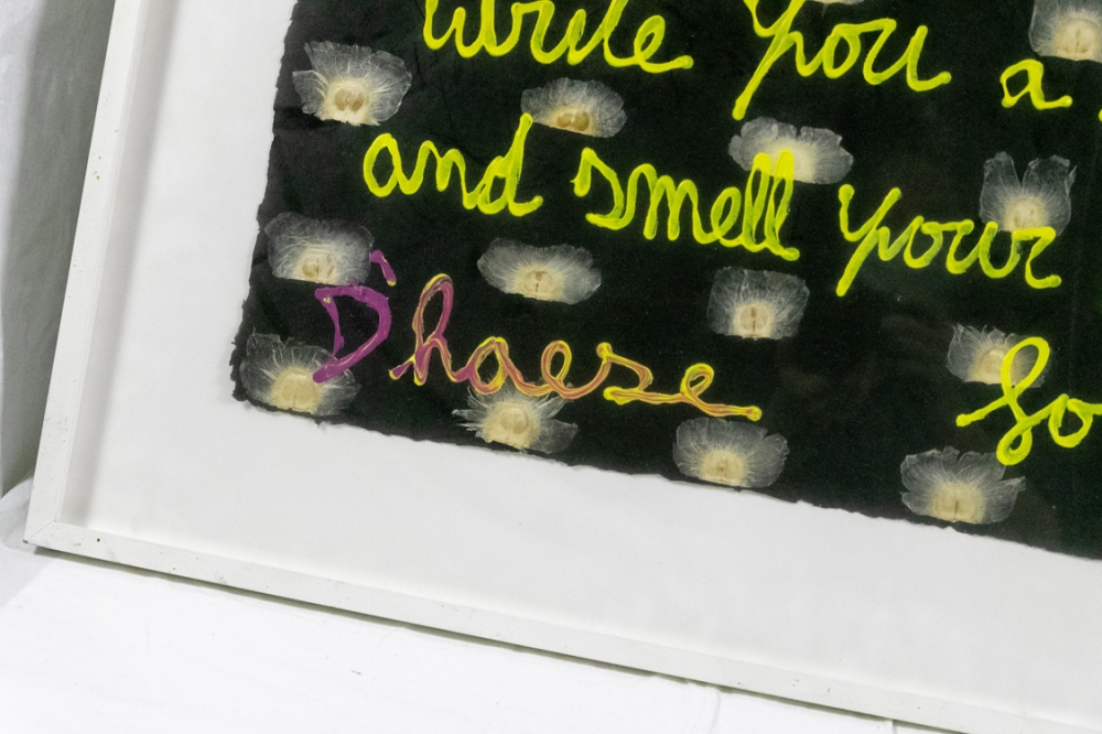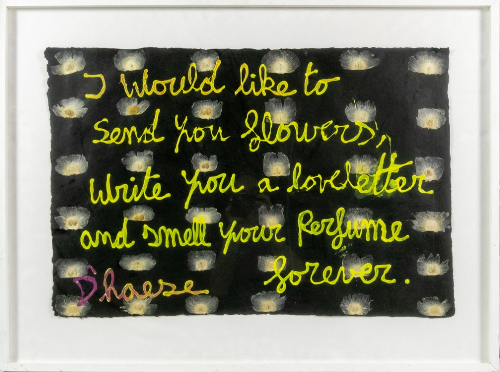 Acrylverfschilderij op papier, aangevuld met bloemen van Hannes D'Haese.