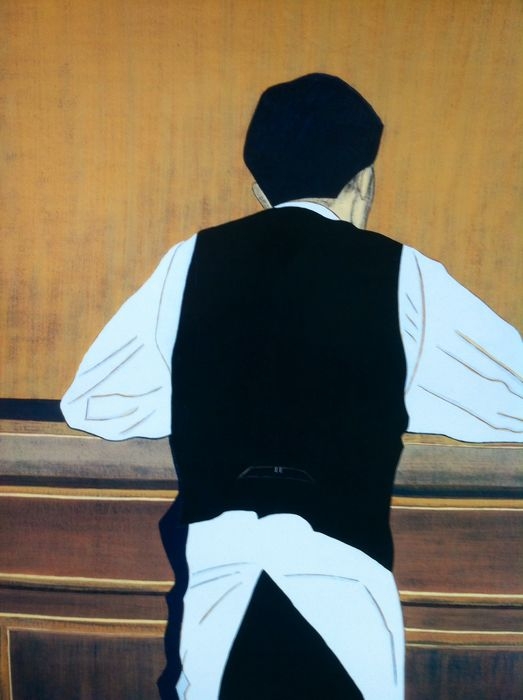 Bruno Vekemans (Antwerpen, 1952), Ober aan de bar, gedateerd rechtsonder: Vekemans '93, print op patroonpapier, 78 x 55 cm echt een reclame poster Bruno Vekemans maakt deel uit van een lange traditie van Vlaamse schilders, een traditie die nog nooit is verbroken, zelfs niet wanneer de schilderkunst dood werd verklaard. Vekemans behoort wel degelijk tot de generatie die de moeilijkste tijd had om geaccepteerd te worden als schilder. In Heel goede staat, 78 bij 55 cm
