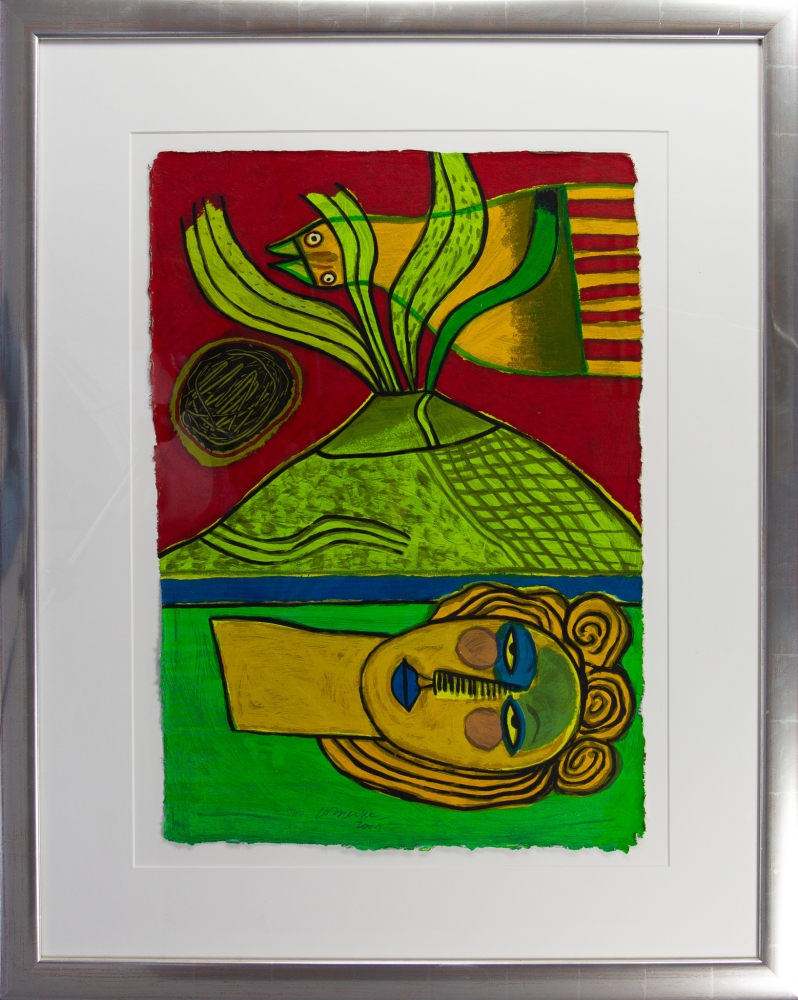 Het werk is ingelijst in een zilverkleurige gecontourde lijst.