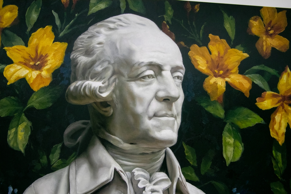 The work has a kind of surrealistic appearance. The contradiction of the lack of the pedestal in a marble statue reminds me of Magritte.