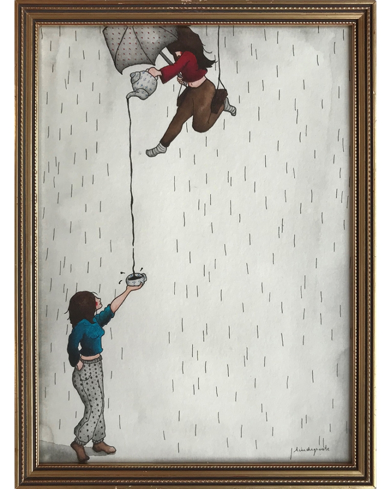 The illustration is about friendship, and the importance of the seemingly small things in life. Like a cup of hot coffee on a cold rainy day.