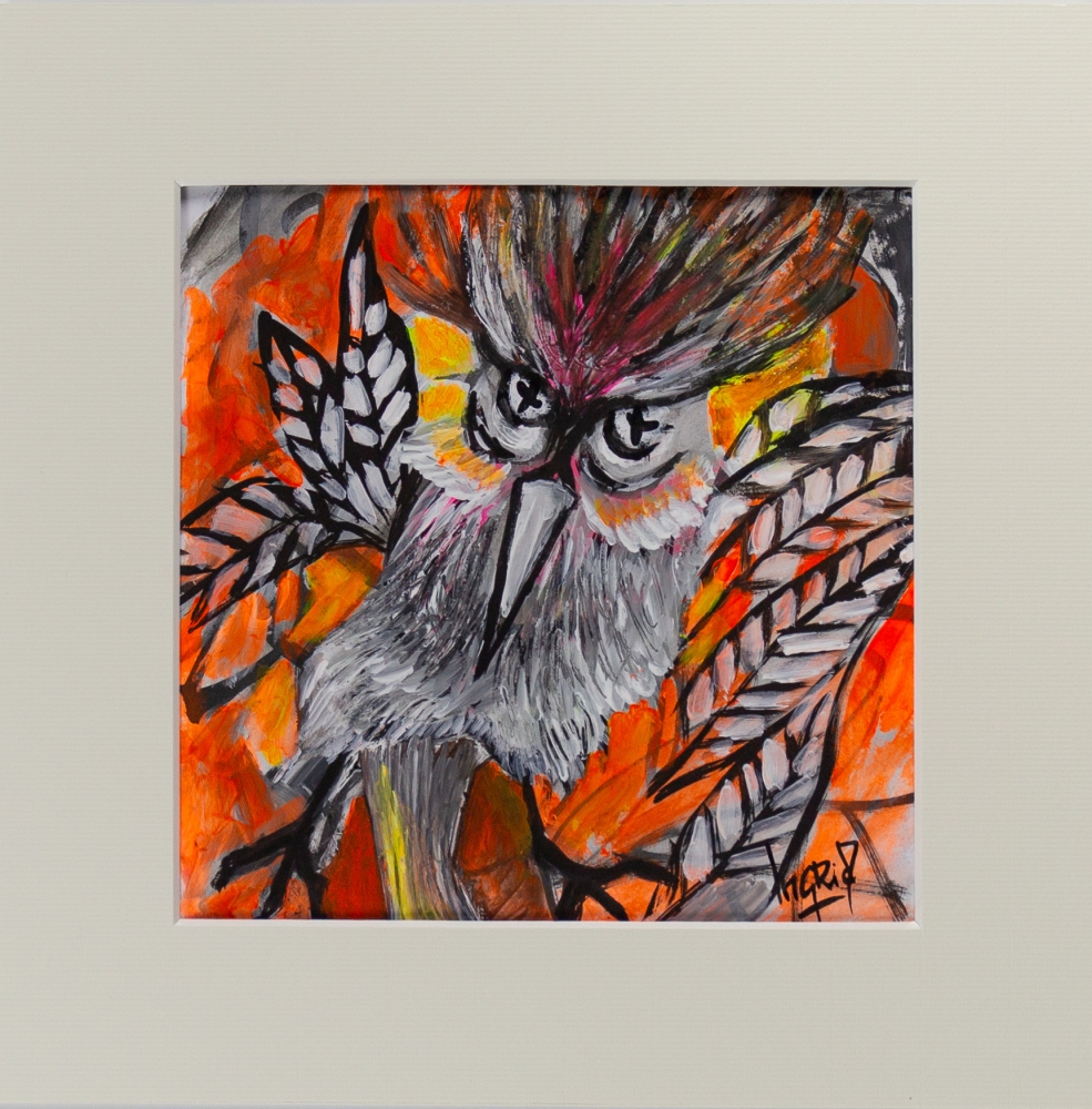 Zeer kleurrijk origineel schilderij op papier van Ingrid Janssen. Het werk is voorzien van een witte passe-partout. Afmeting 20cm x 20cm is het beeldformaat van het schilderij. Ingrid (Janssen) is een Belgische schilder, grafisch ontwerper, opleiding aan de Academies van Doornik, Oostende en Duinkerken. Figuratieve stijl doordrenkt met symboliek. Diversiteit in onderwerpen en technieken. Het leven beweegt! "Van de delicate en zorgvuldige aard van de fijne veer tot de rauwe penseelstreken die naar voren komen, maakt Ingrid het meeste uit elk hulpmiddel, elke techniek volgens de stemming, het moment, altijd ten dienste van expressie. Nieuwsgierig van aard, geïnteresseerd in alles, variëren haar onderwerpen in grote rijkdom. Ze is aan het verkennen, blijf niet op het goede spoor »
