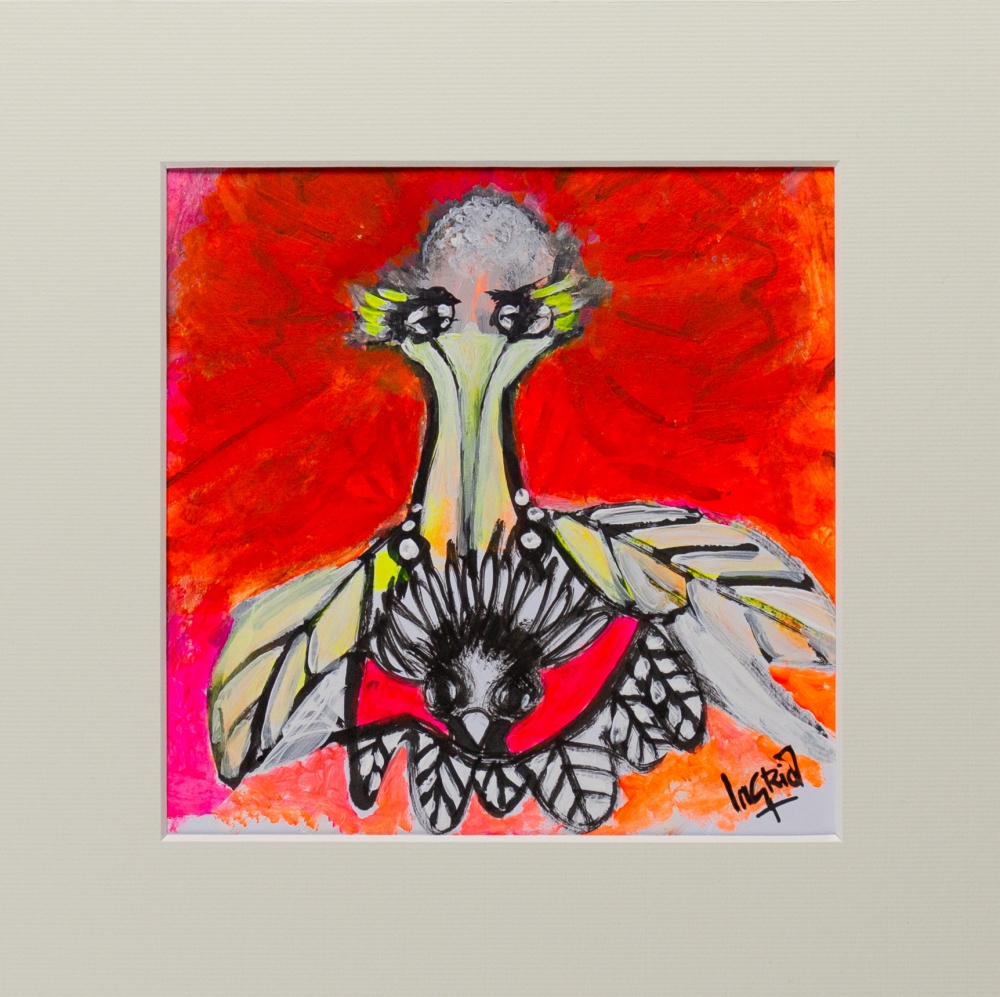 Zeer kleurrijk origineel schilderij op papier van Ingrid Janssen. Het werk is voorzien van een witte passe-partout. Afmeting 20cm x 20cm is het beeldformaat van het schilderij. Ingrid (Janssen) is een Belgische schilder, grafisch ontwerper, opleiding aan de Academies van Doornik, Oostende en Duinkerken. Figuratieve stijl doordrenkt met symboliek. Diversiteit in onderwerpen en technieken. Het leven beweegt! "Van de delicate en zorgvuldige aard van de fijne veer tot de rauwe penseelstreken die naar voren komen, maakt Ingrid het meeste uit elk hulpmiddel, elke techniek volgens de stemming, het moment, altijd ten dienste van expressie. Nieuwsgierig van aard, geïnteresseerd in alles, variëren haar onderwerpen in grote rijkdom. Ze is aan het verkennen, blijf niet op het goede spoor »
