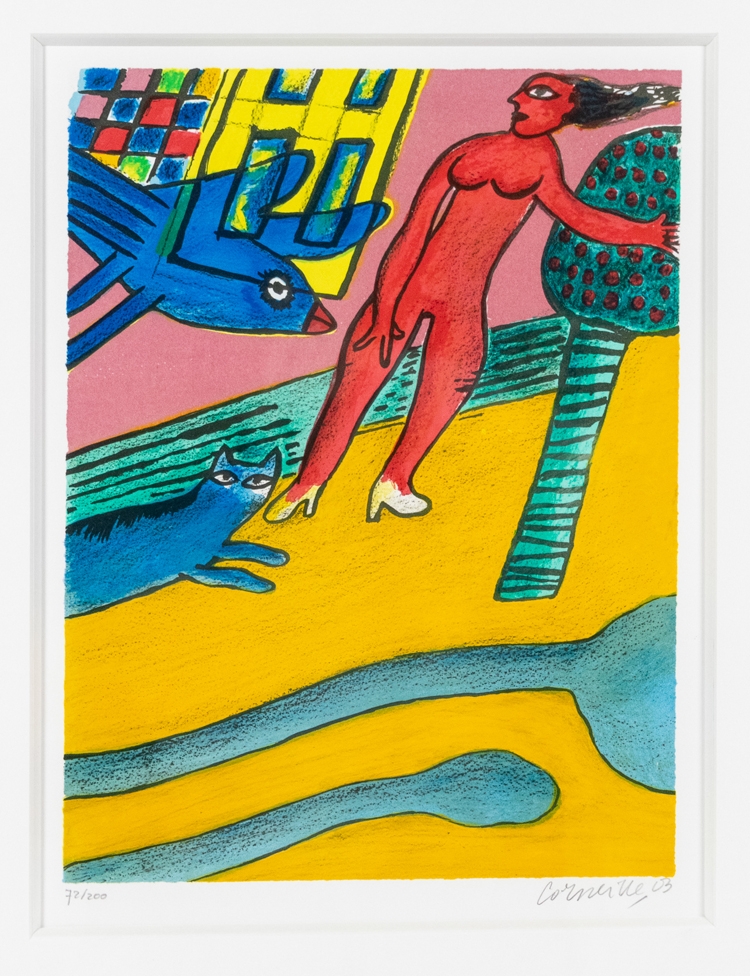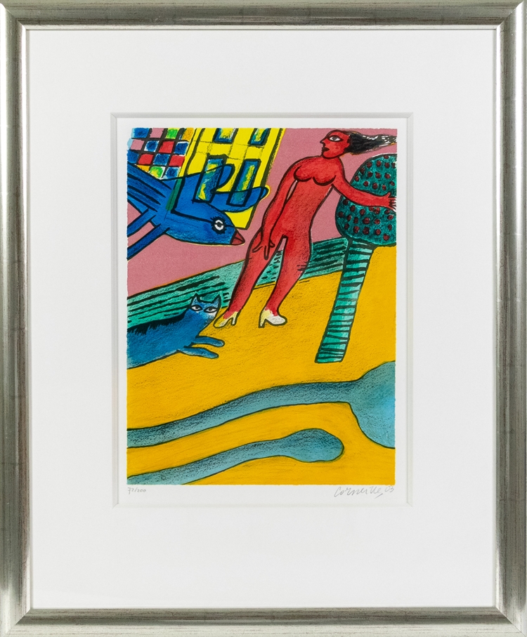 Color lithograph by Guillaume Corneille, from 2003. Signed and numbered by hand. The work is framed in a silver-coloured frame.