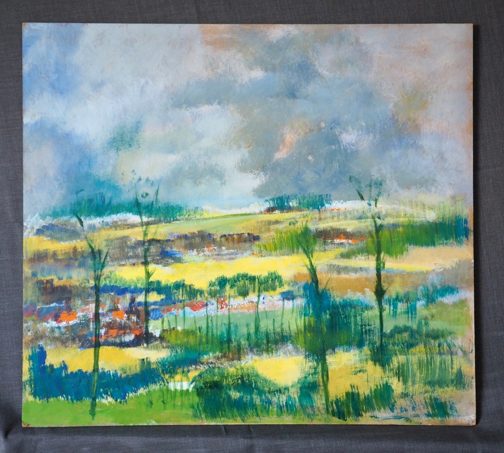Dorp in Haspengouw Priester Schilder EH. Leo Weltjens. (1915-2011) op paneel 68x60 cm. Auto-didact, volgde wel privé-les in Maastricht , kwam in Tongeren in contact met Paul Noldus en Jaak Savenay (Hemotech.be). Zijn werk evolueerde van figuratief naar meer abstract. Leraar Phiko Hasselt, verschillende tentoonstellingen prov. Limburg. Zie ook boek Leo Weltens van Fernand Haeren 9/2007 bij Design Partner Opglabbeek.