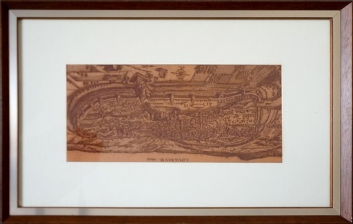 Koperafdruk met stadsplan van 17de eeuwse Leuven. 29x14 cm in kader onder glas. 47x32 cm. Op de gravure is de toenmalige stadsomwalling afgebeeld met de poorten en verdedigingstorens. Buiten de wallen is de ploeger aan het werk en naderden bezoekers de stadspoort.