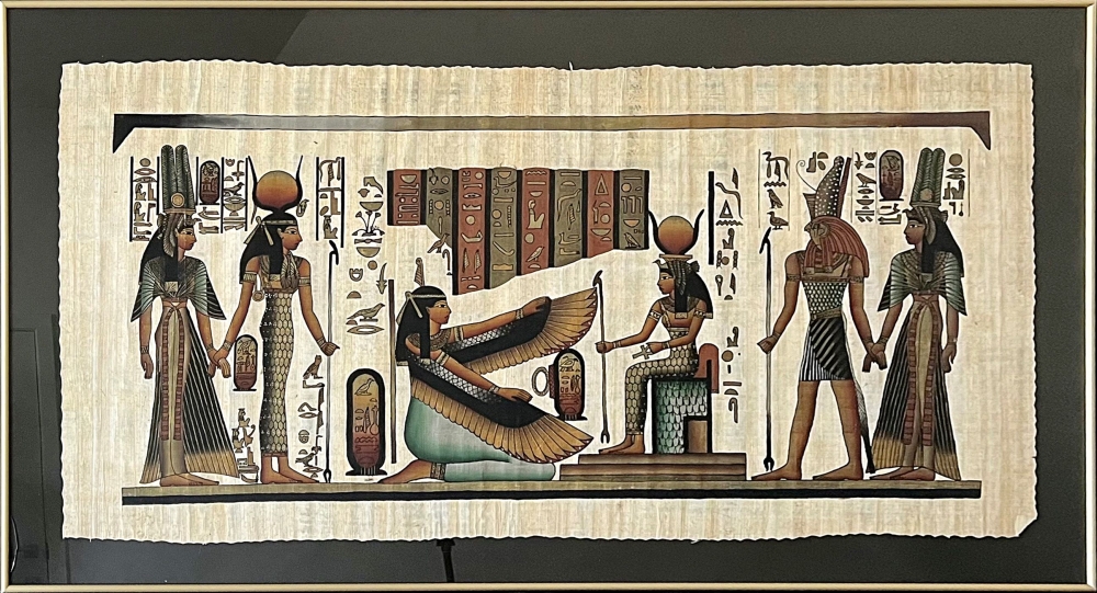 Klassiek Egyptisch tafereel op papyrus. Een hofhouding is afgebeeld waarbij een figuur met knielt voor de vorstin en links en rechts telkens twee personen toekijken. In kader onder glas, in de linkse hoek onder is er een kleine barst in de zijkant.