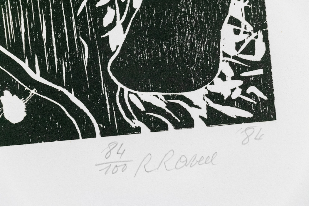 Roger Ravel. For the gate (i). 1984. Black and white woodcut: 320 x 418 mm (etching dimensions) 505 x 655 mm (sheet dimensions). Signed and numbered 84/100. Described in the graphic oeuvre nr 144, p. 128. Not framed.
