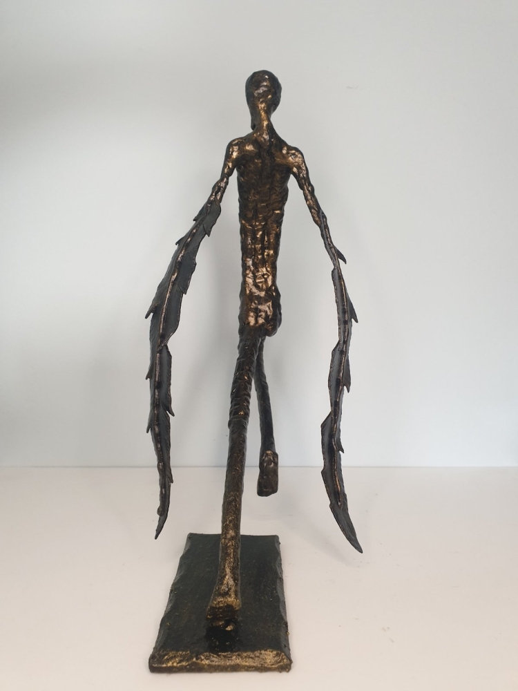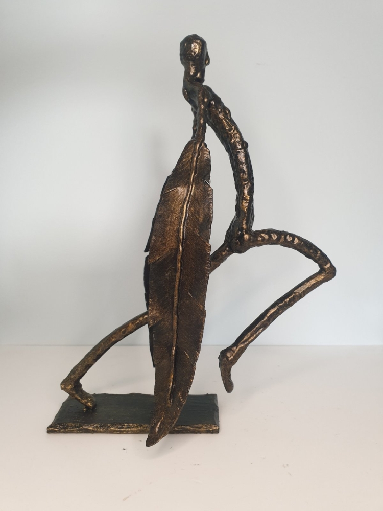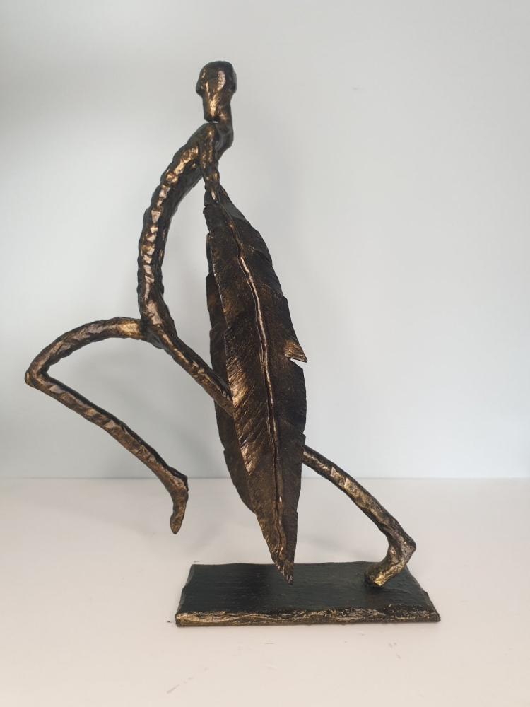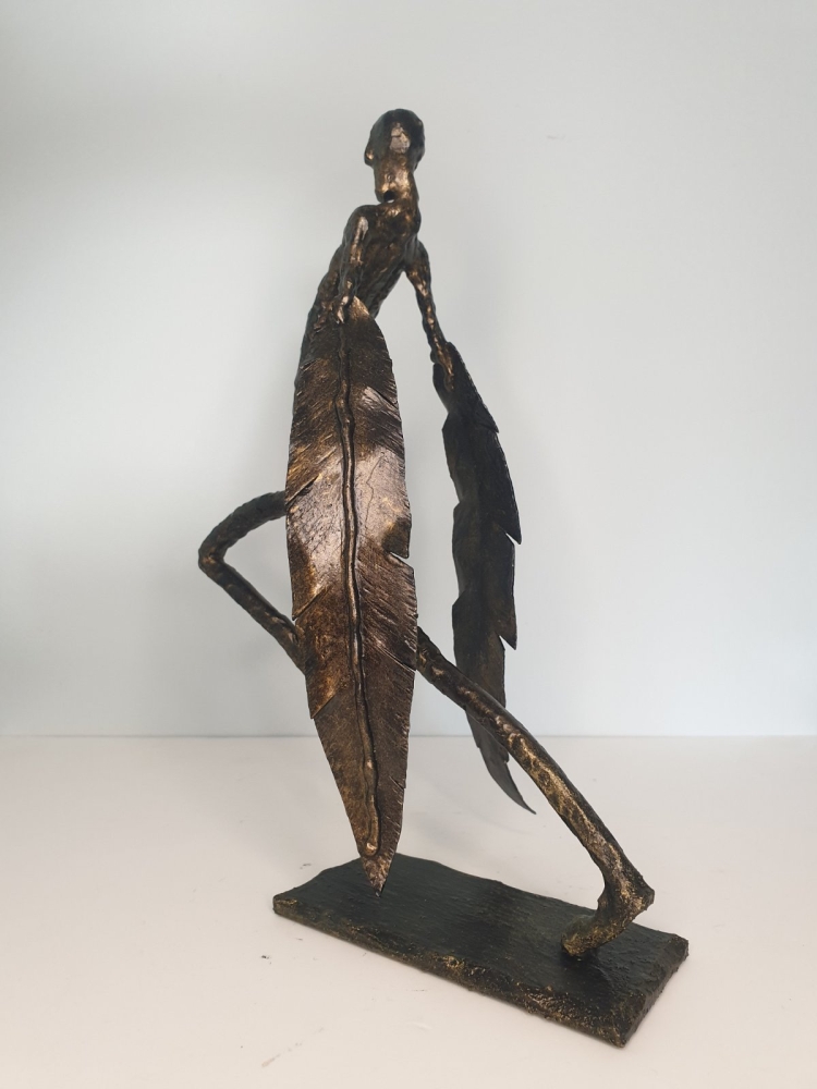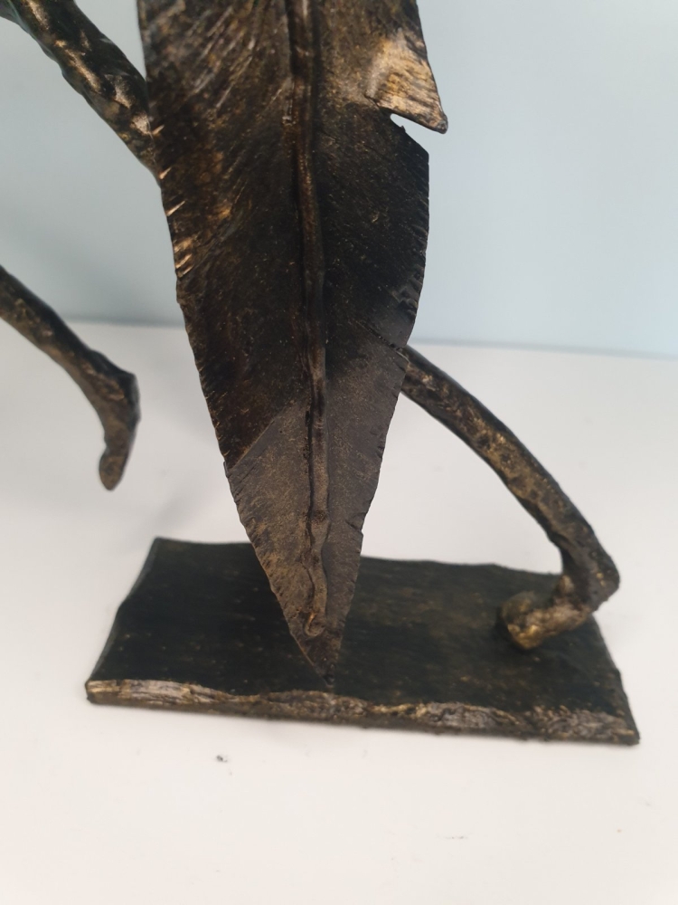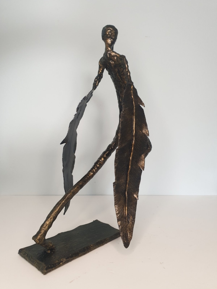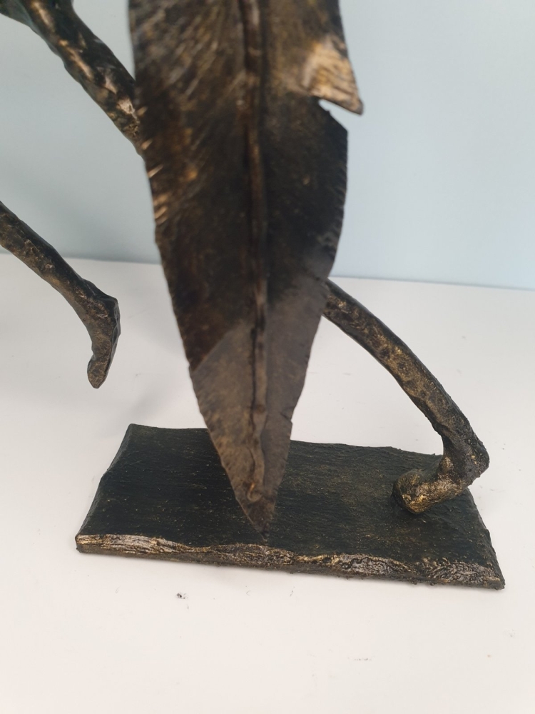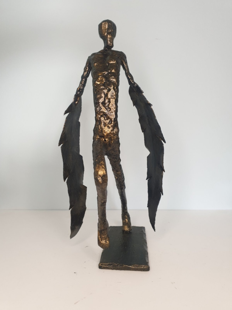 Man with feathers called "Wings" sculpture from S-art studio. Unique welded and forged metal sculpture,coloe: black witg golden wax, sprayed with transparent spray for protection. One of a kind work, comes with a certificate of authenticity. IMPORTANT NOTE: SHIPPING TO THE EU ONLY - NO SHIPPING TO NON-EU COUNTRIES.