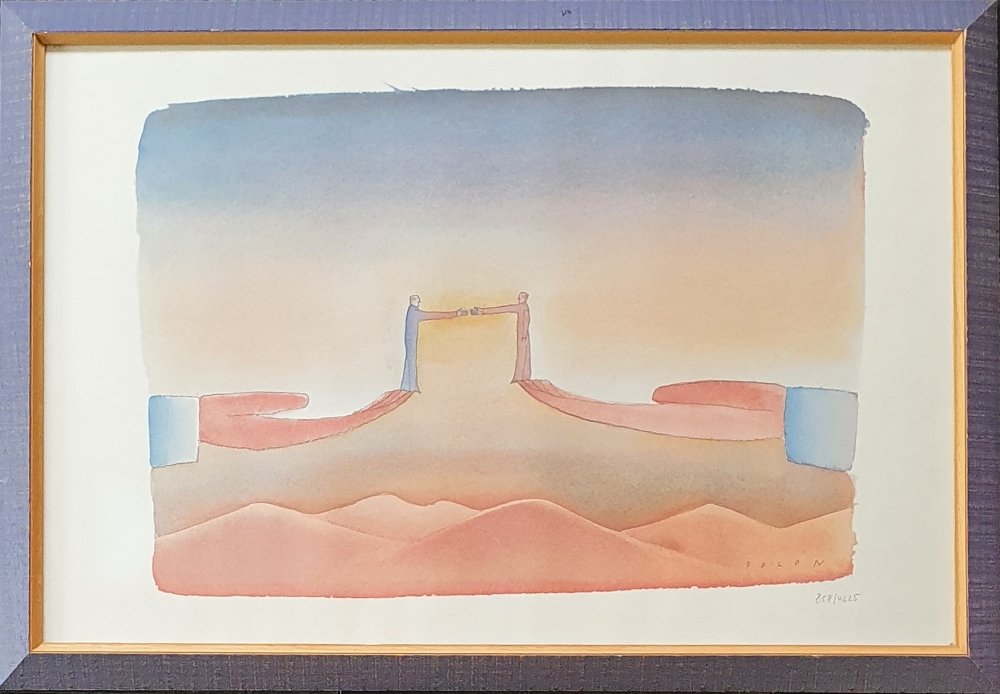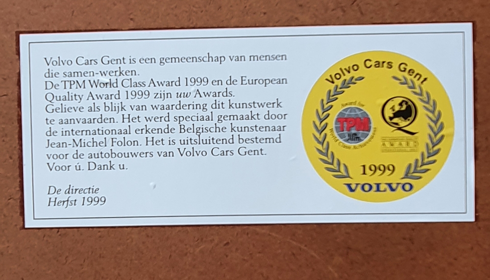 Beautiful color offset lithograph by Jean-Michel Folon designed and published for Volvo Cars Belgium in 1999. The work is in good condition and is still in its original frame. The signature is printed and the work is numbered 858/4225.