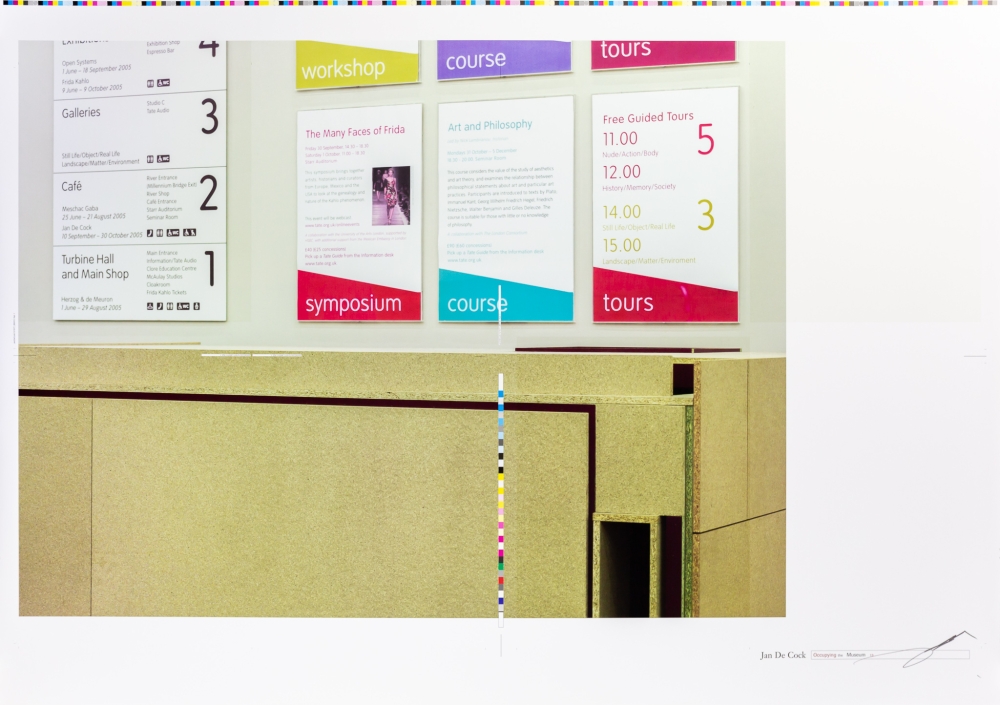 Gesigneerde print (p13) van Jan de Cock's "Occupying the Museum" van 2005-2012. Het werk Occupying the Museum is een tentoonstelling op papier van de bezetting Denkmal 53 in Tate Modern. Een tachtigtal kaders gaan in op verschillende aspecten van het werk van De Cock en op de reactie van toeschouwers op zijn installaties. De kunstenaar duidt zijn werken aan met Denkmal, het Duitse woord voor monument. Tegelijk bestaat het uit de woorden denk en mal en kan het dus gelezen worden als een vorm voor het denken, over de relatie van de kunstenaar tot de museumwereld. De Cock wil de realiteit een nieuwe vorm geven, en de toeschouwer uit zijn normale denkpatroon halen.