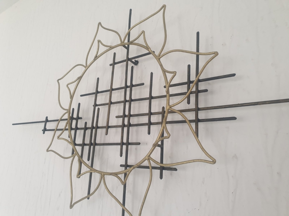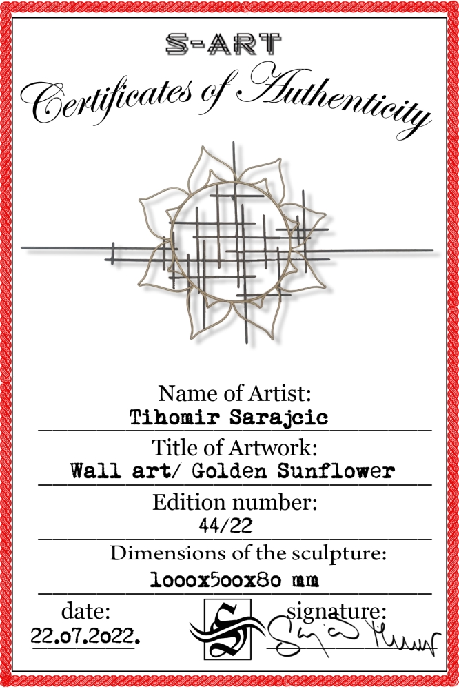 Wall art/ golden sunflower dimension: 100x500x80mm material: Carbon Steel color: black with golden wax, sprayed with transparent spray..... One of a kind work Unique work, comes with a certificate of authenticity. IMPORTANT NOTE: SHIPPING TO THE EU ONLY - NO SHIPPING TO NON-EU COUNTRIES. Tihomir Sarajcic is owner of S-art Croatian craft studio/workshop that composes sculptures with welded and painted iron/ metal and wall art. Exhibitions since 2015 and 2017 in city library Slavonski Brod. The S-art studio also participate on art festivals.....