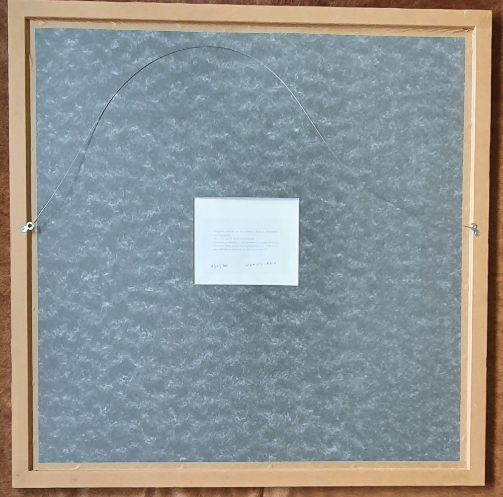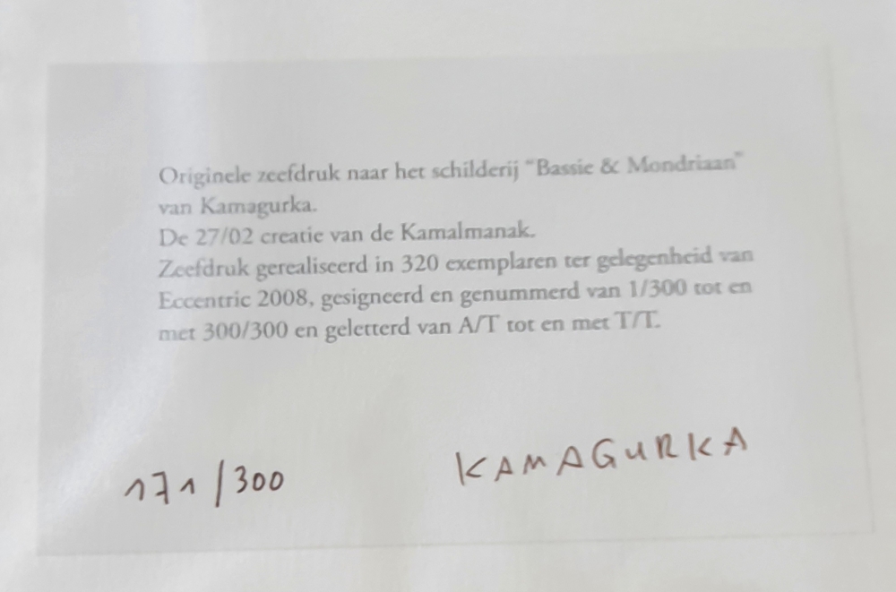 Color screen print by the Belgian artist Kamagurka. The screen printing was realized in 320 copies (1-300/300 and A-T/T) on the occasion of Eccentric 2008. The work is framed in a blue frame.
